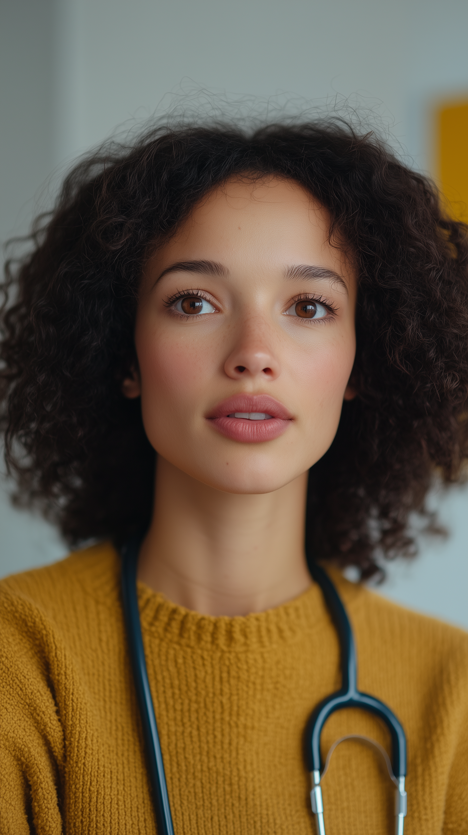 Confident young woman with curly hair and stethoscope, wearing a mustard sweater. Professional and serene expression.