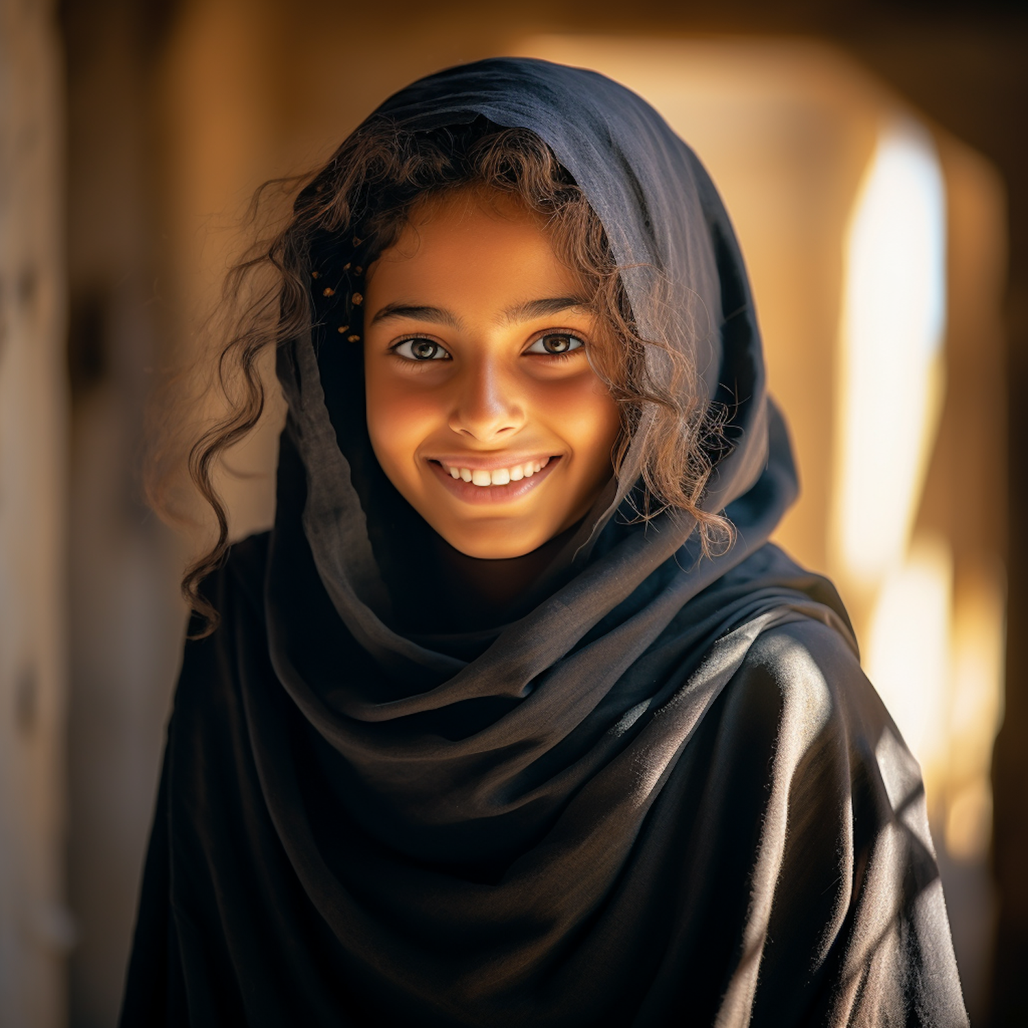 A young girl with a joyful smile, wearing a black headscarf, stands in soft sunlight, creating a serene and inviting atmosphere.