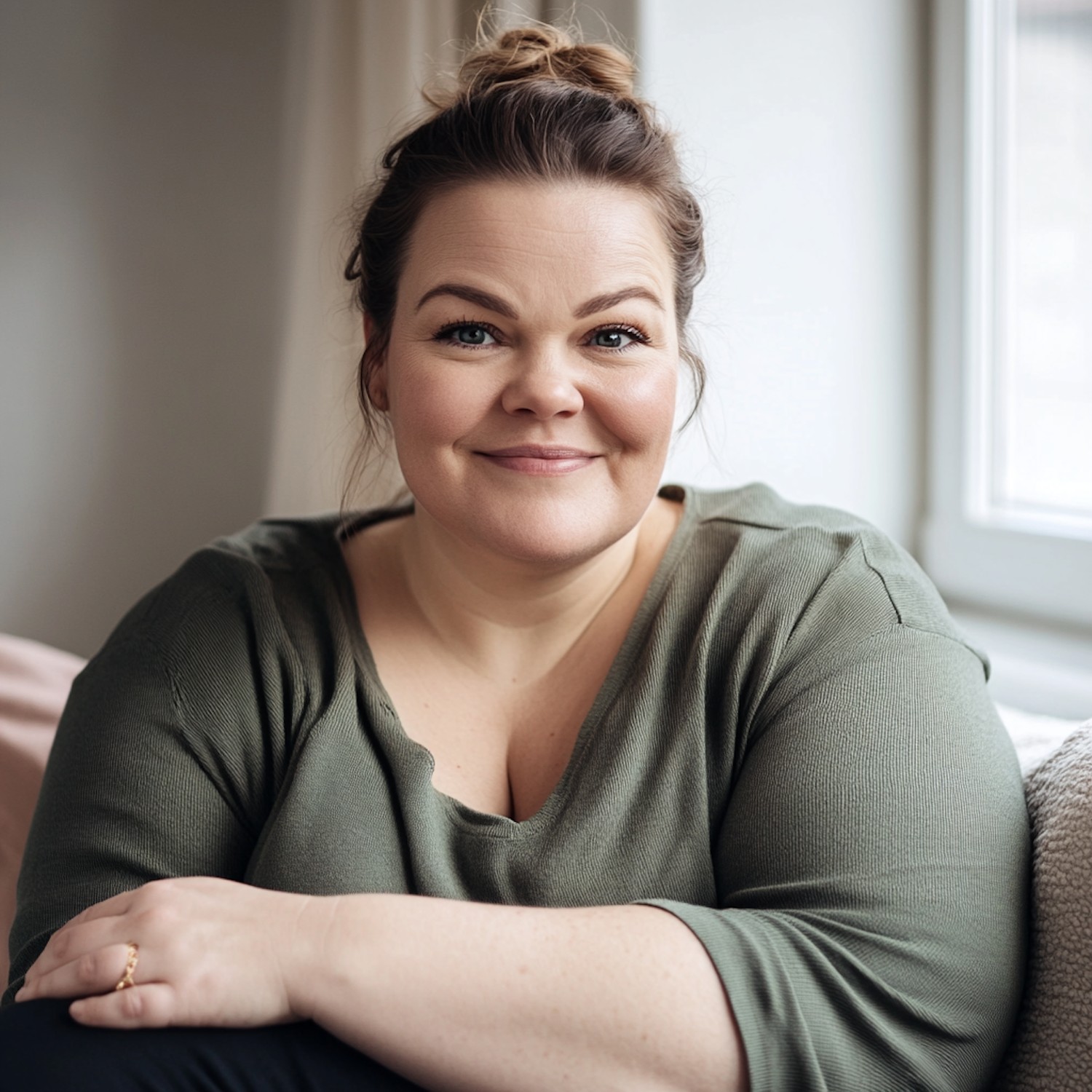 Smiling woman with light brown hair in a bun, wearing a green top, sitting indoors by a window with natural light.