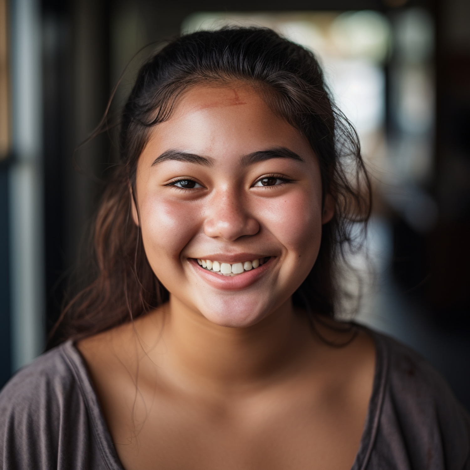 Smiling young Asian woman with long dark hair and glowing skin, wearing a casual top. Softly blurred background enhances her cheerful expression.