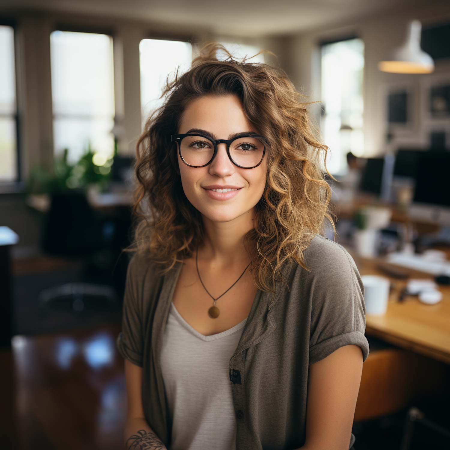 Smiling woman with curly hair and glasses in a modern office setting, wearing a casual outfit and a necklace.