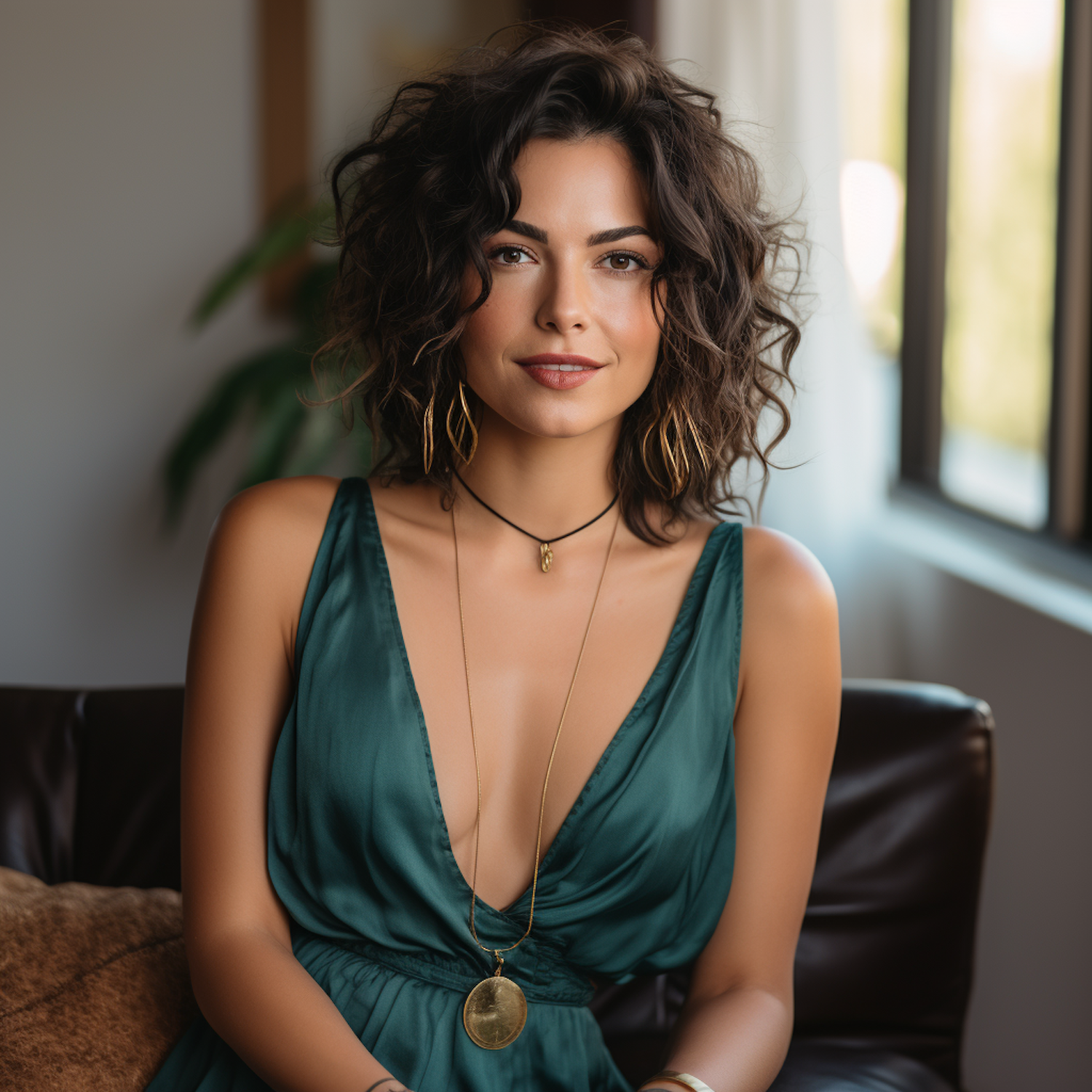Woman with curly hair in a green dress, accessorized with gold jewelry, sitting on a couch in a cozy indoor setting.