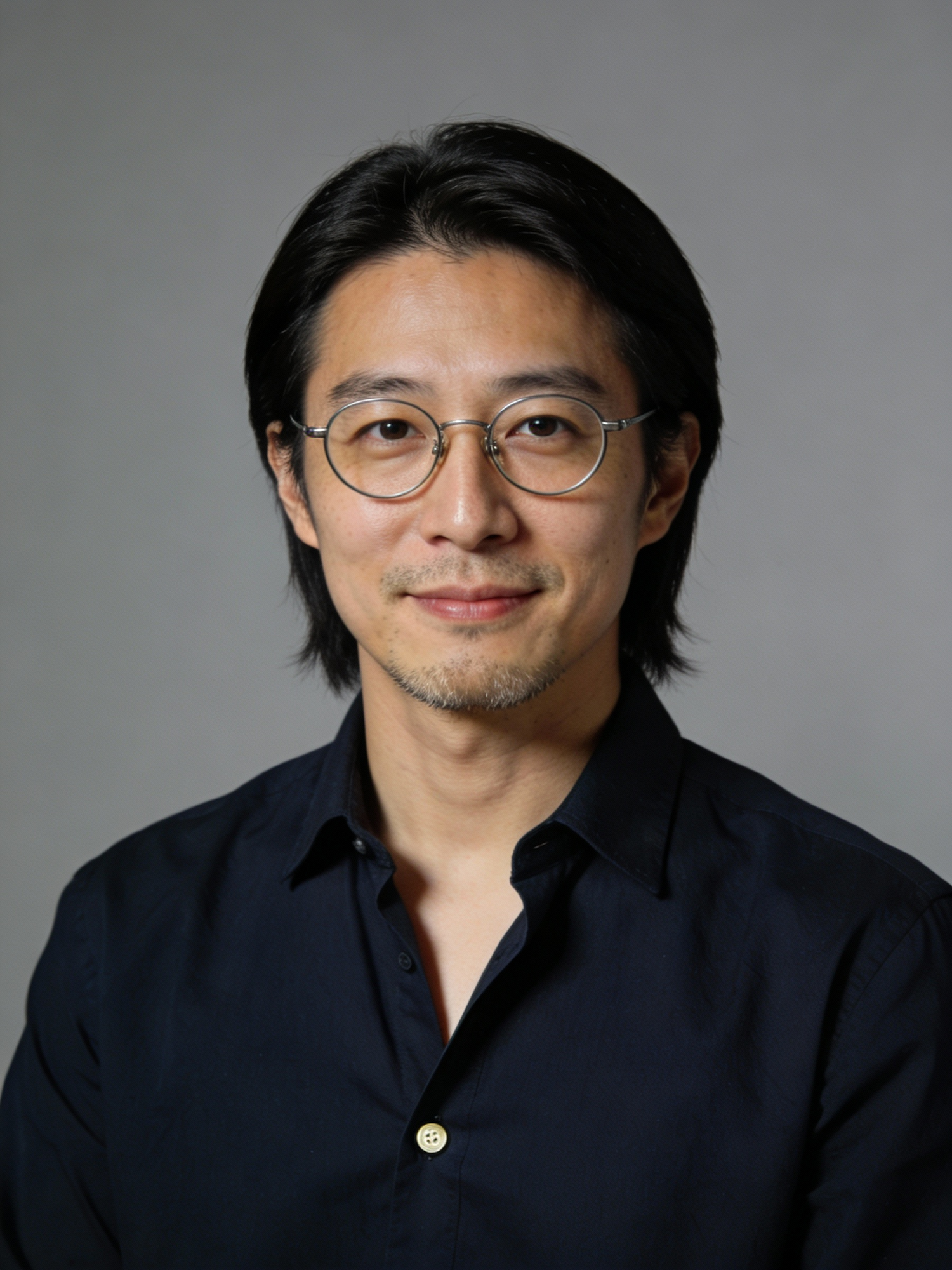 Studio portrait of a Japanese male AI researcher, age 34; light skin, neutral undertone; straight black hair, medium length, brushed back; light stubble; round metal eyeglasses; dark navy button-up shirt, top button open; neutral mid-gray seamless backdrop; Rembrandt lighting with soft fill; 105 mm macro-sharp. Expression: thoughtful and calm, subtle closed-mouth smile. Framing: portrait orientation, 3:4 ratio; mid-chest-up composition. Subject centered in frame, camera at eye level, facing directly toward the camera (front view). Full head and hair completely inside the frame with a little space above; both shoulders visible, no cropping at the top or sides. Neutral studio composition, no props.