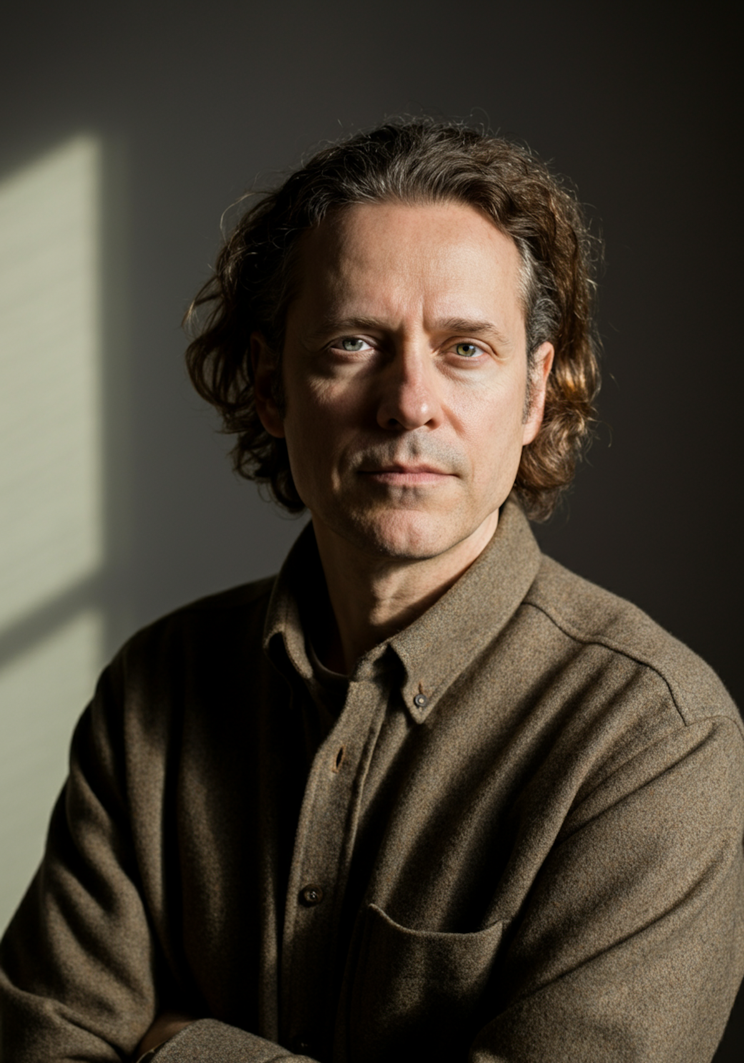 Portrait of a man with wavy brown hair and a brown shirt, set against a neutral background with soft, directional lighting.