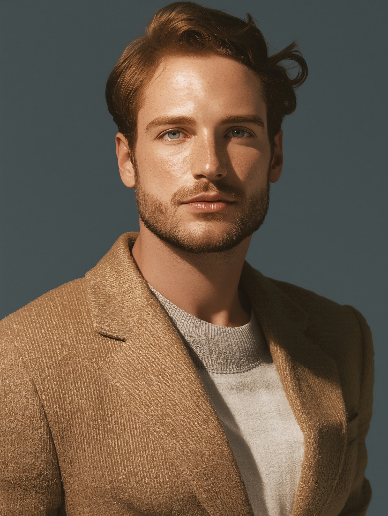 Stylish portrait of a man in a tan blazer and gray sweater against a muted blue background, showcasing a modern and polished look.
