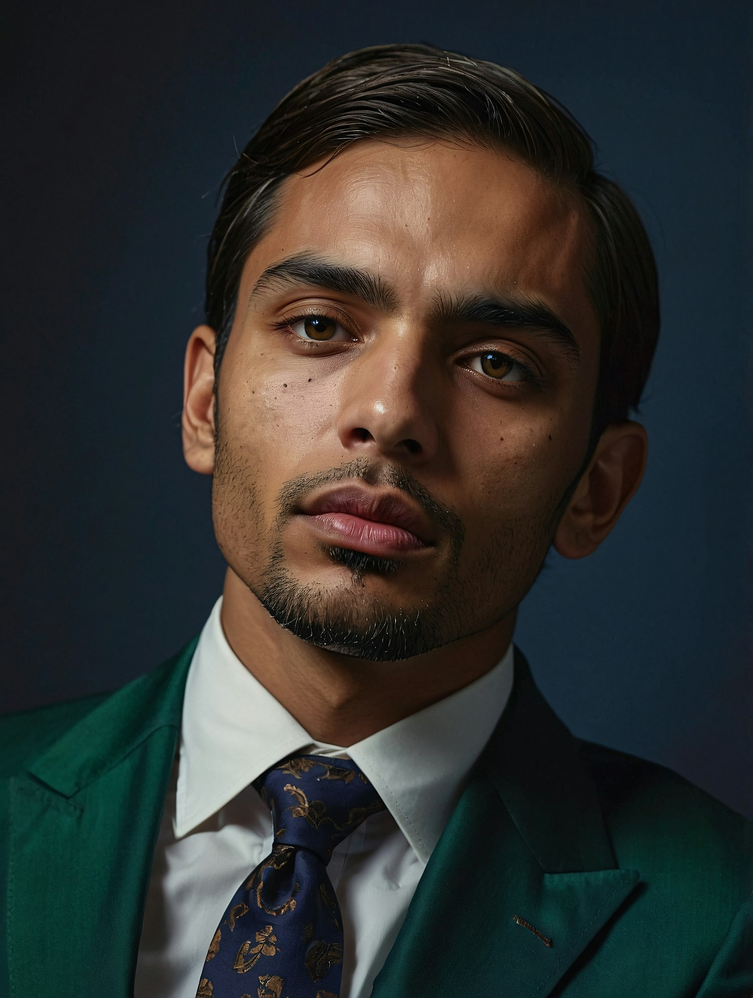 Confident young man in a green suit with a floral tie, gazing at the camera against a deep blue background.