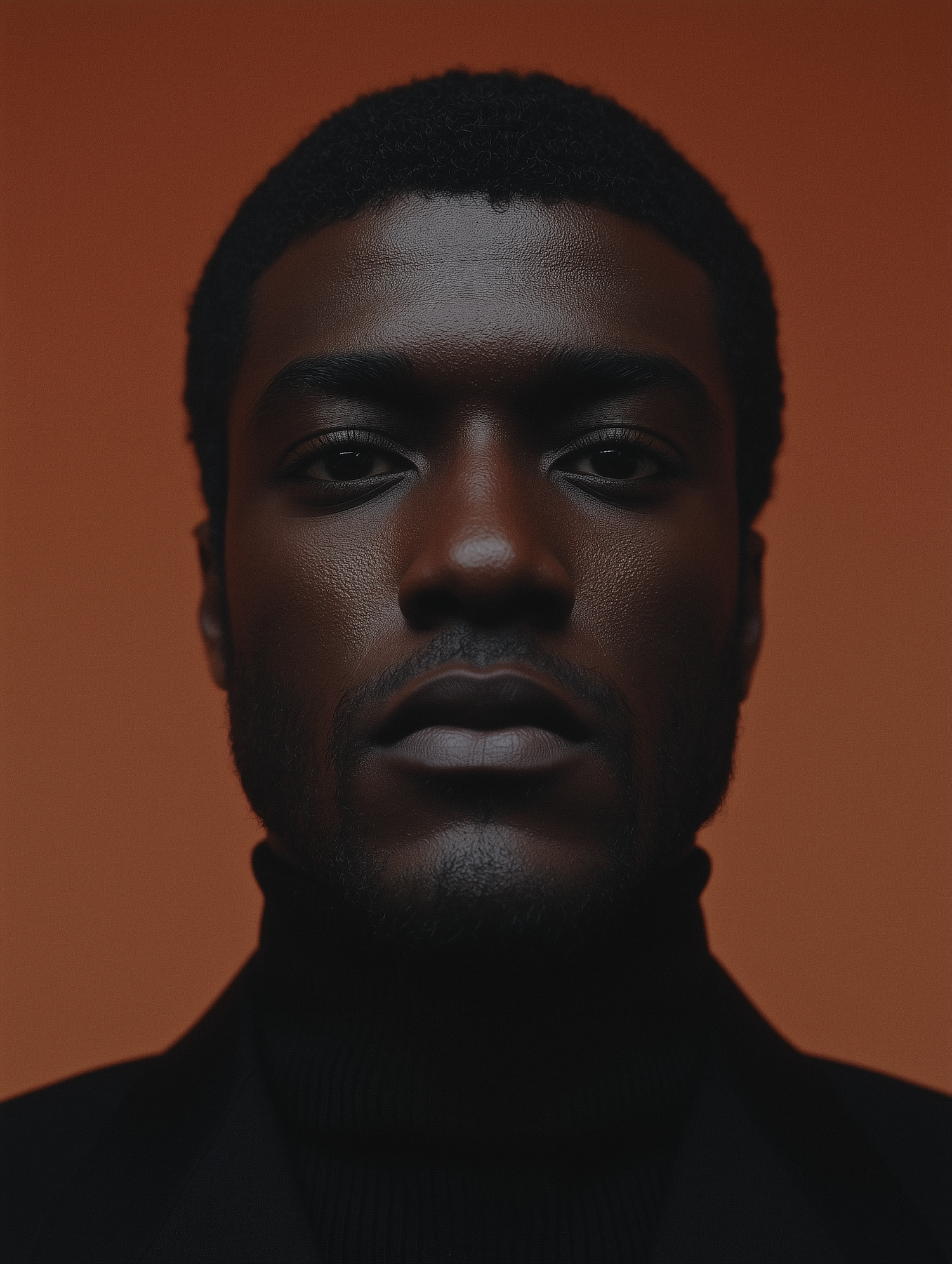 Close-up portrait of a Black man in a black turtleneck against a warm orange background, showcasing a calm expression.