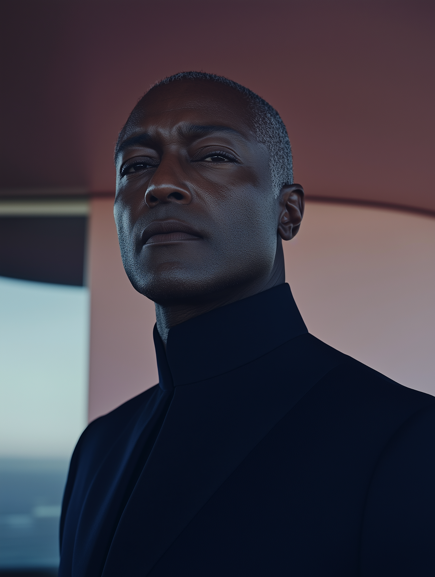 Close-up of a confident man with short gray hair in a sleek navy outfit, set against a modern, softly lit background.