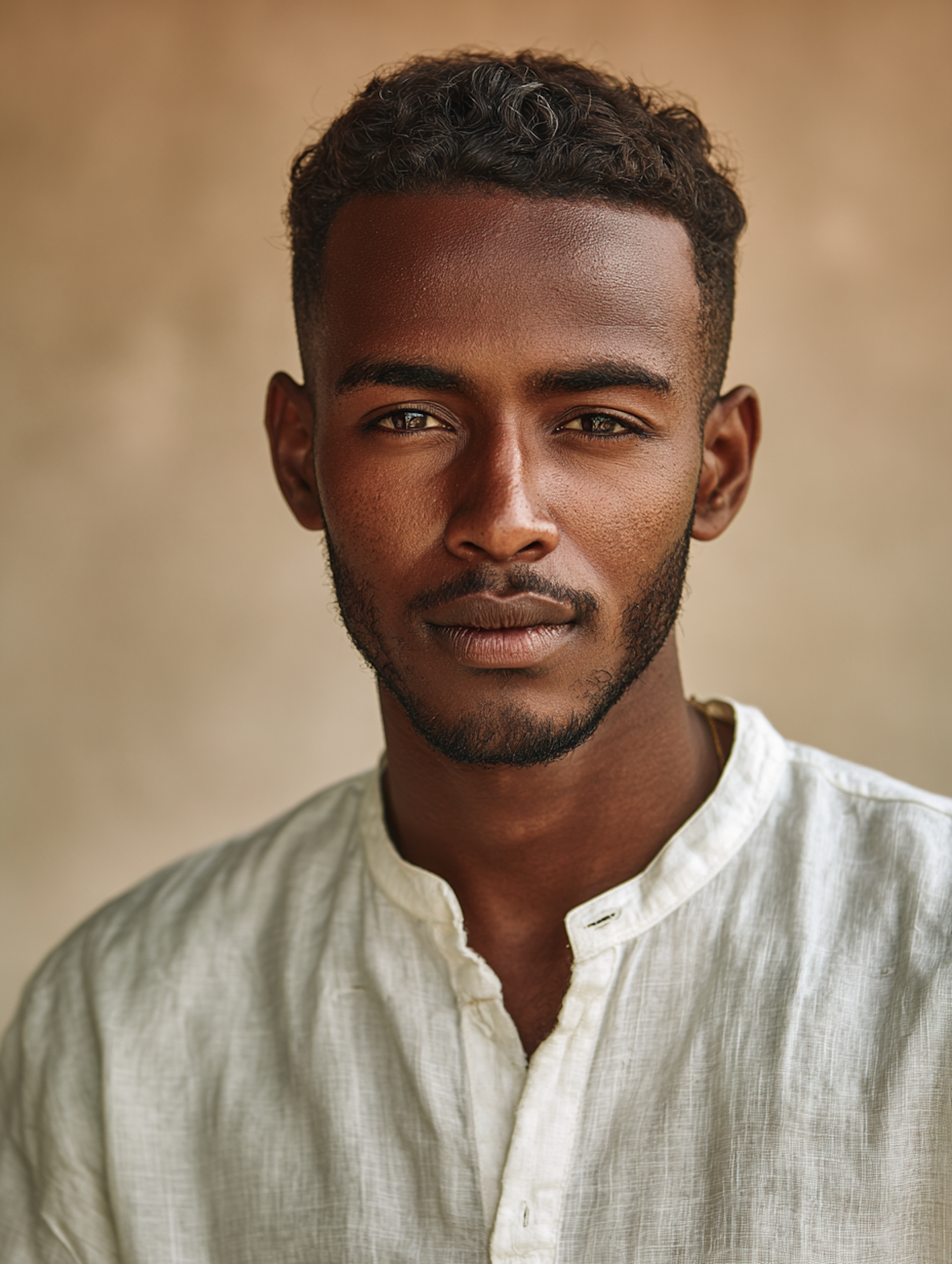 Portrait of a man with short curly hair and a white shirt, set against a soft, neutral background.