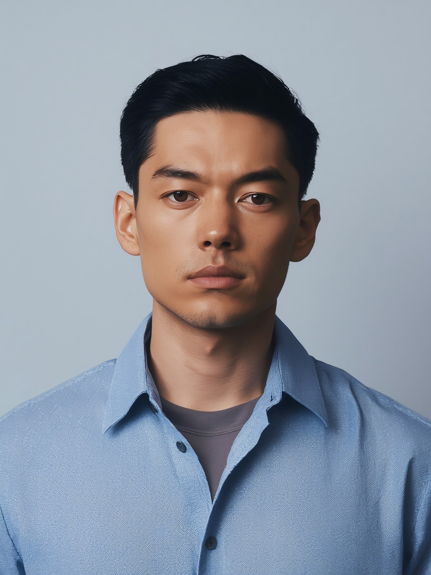 Portrait of a man in a light blue shirt against a soft blue background, with a neutral expression and direct gaze.