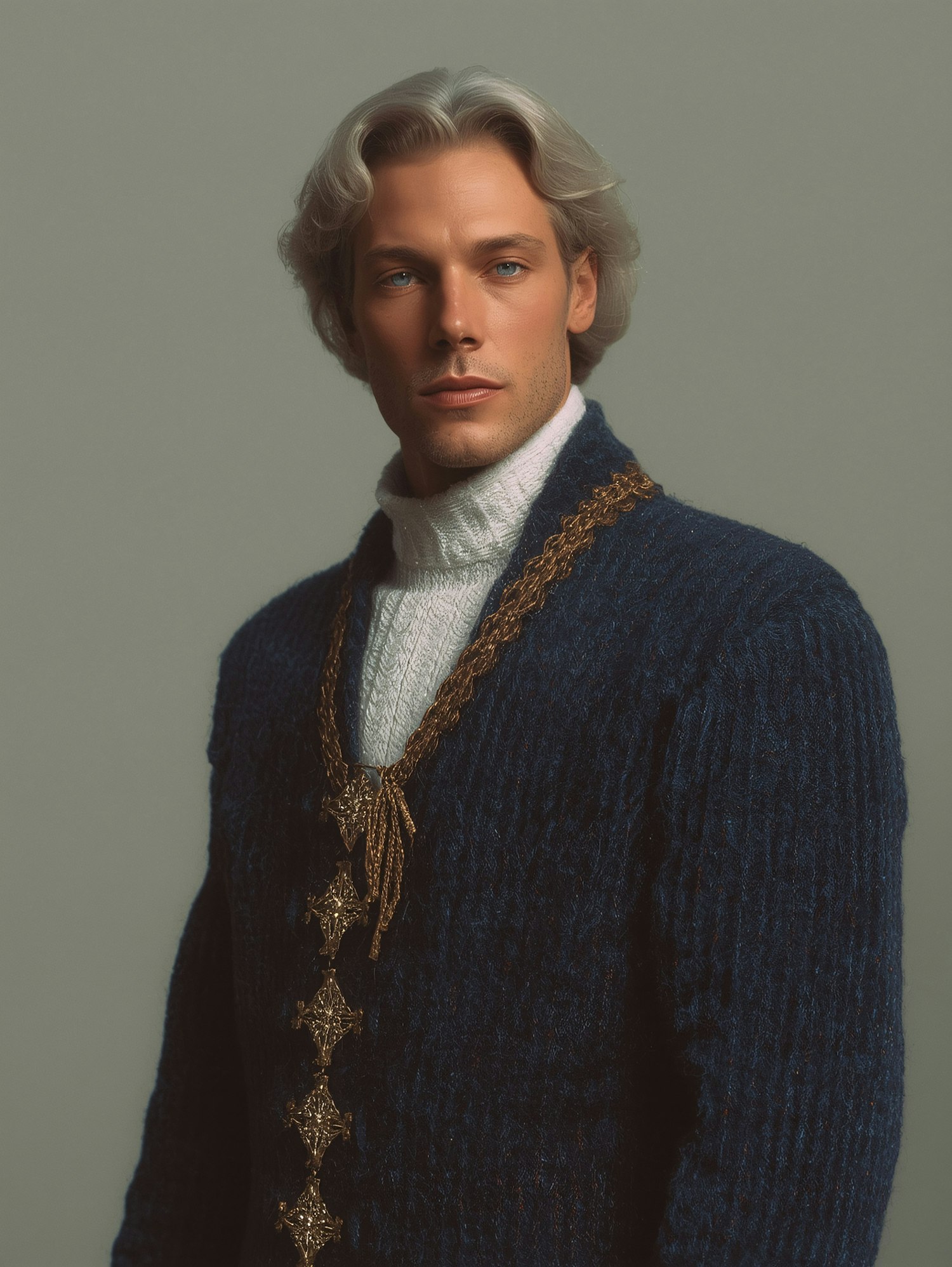 Portrait of a man with silver hair, blue eyes, and a gold chain, wearing a blue sweater and white turtleneck against a gray background.