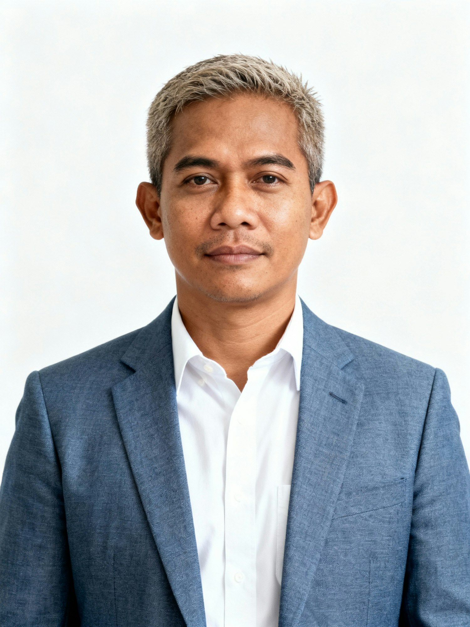 Studio portrait of a Filipino man logistics manager, 34; light-tan skin (neutral); short textured hair; steel-blue blazer over white oxford;. Same Framing / white seamless / high-key / 105 mm. Expression: steady, organized. Negative: warehouse props, color shifts, vignette, tight top crop.
