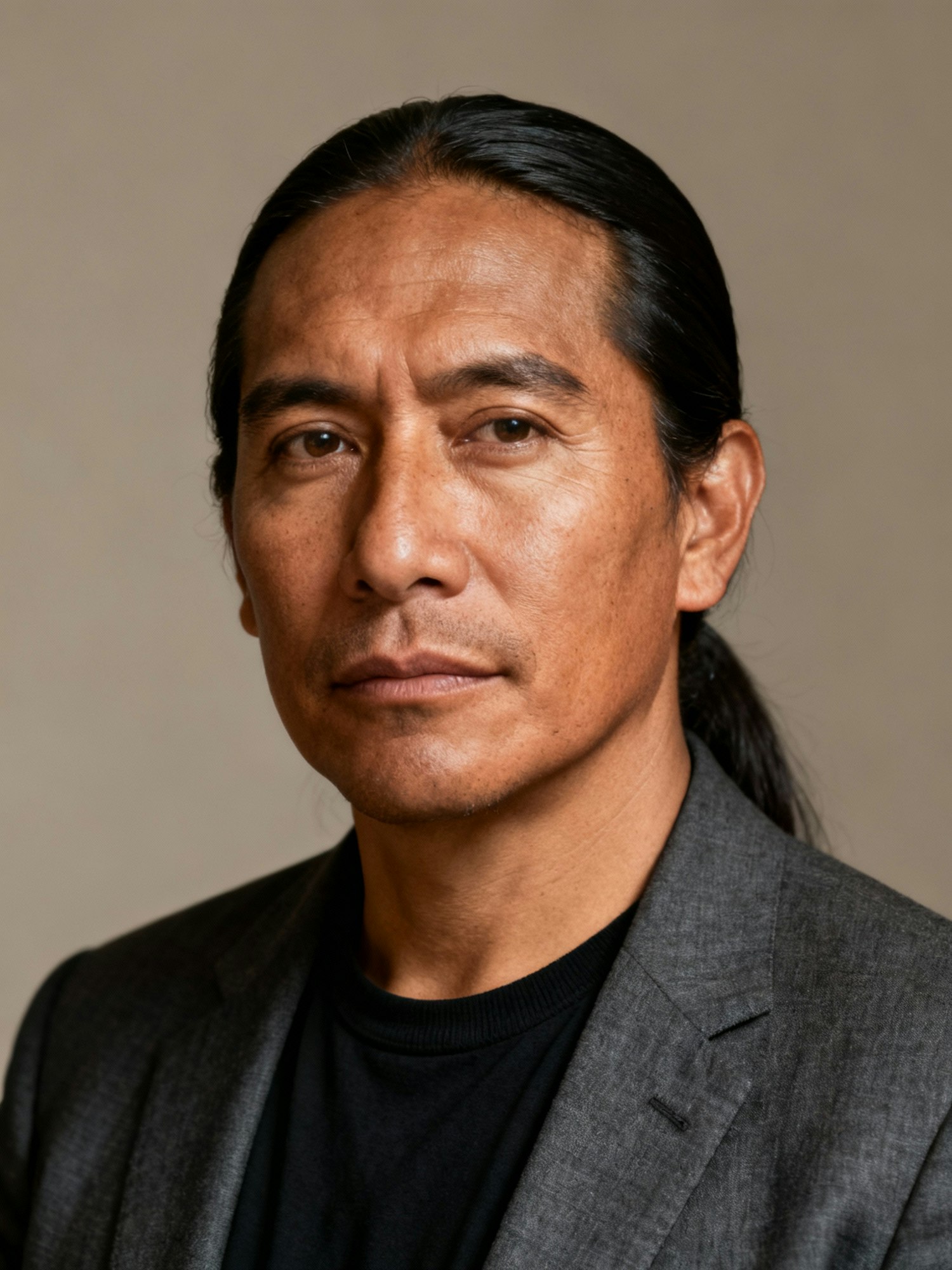 Portrait of a man with long black hair tied back, wearing a gray suit jacket and black shirt, set against a neutral background.