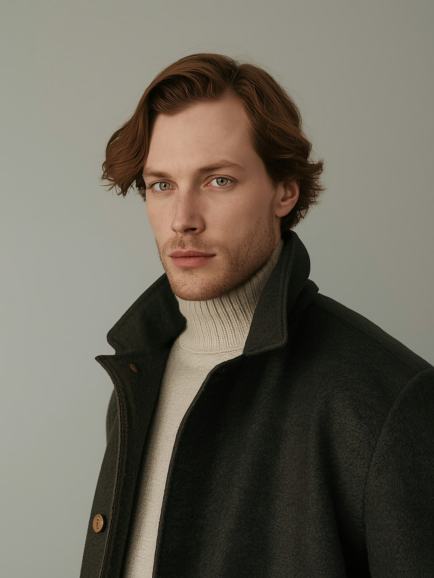 A man with auburn hair and a dark coat over a cream turtleneck, set against a muted gray background, gazes directly at the camera.
