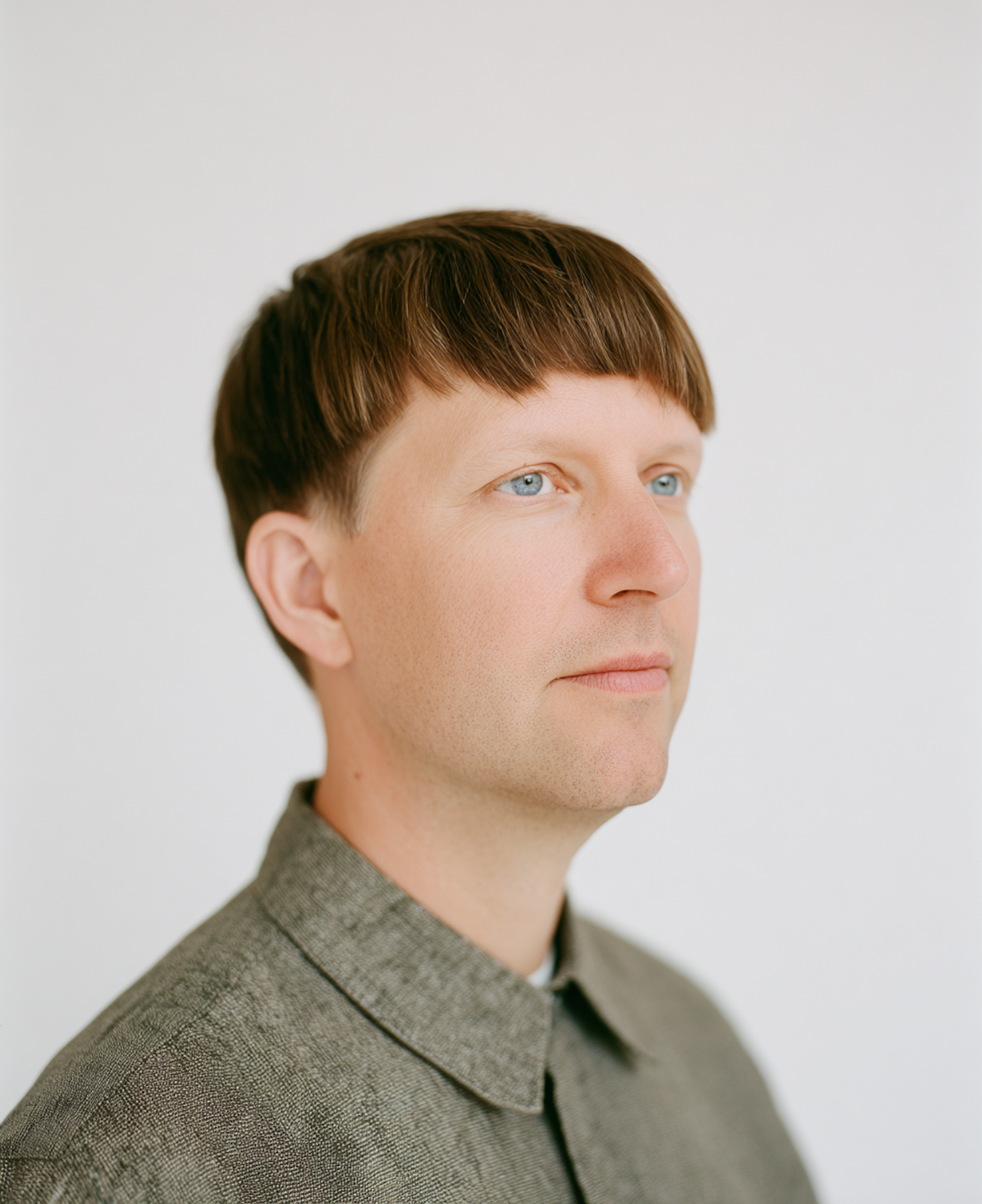 Close-up portrait of a man with a bowl haircut and blue eyes, wearing a gray collared shirt against a plain white background.