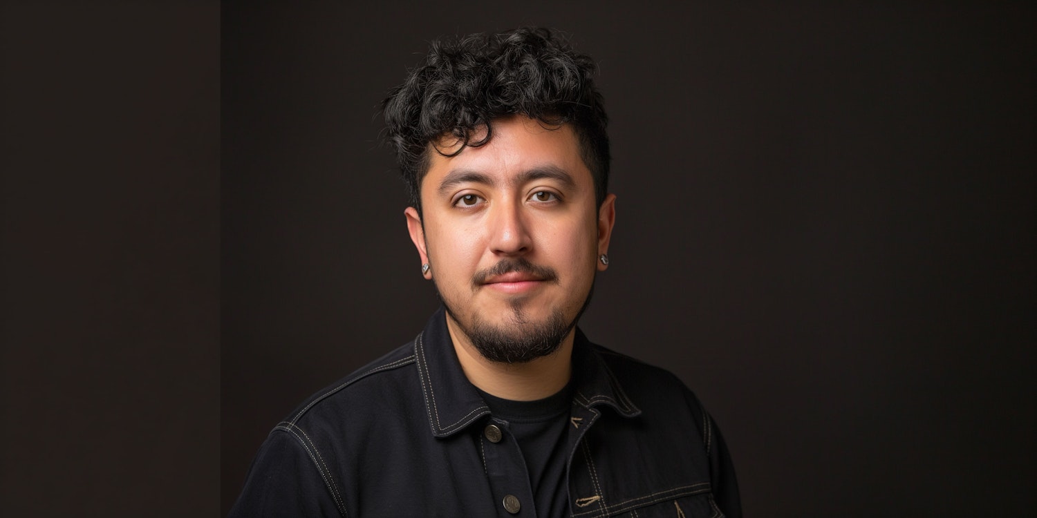 Portrait of a man with curly black hair, beard, and earrings, wearing a black jacket against a dark background.