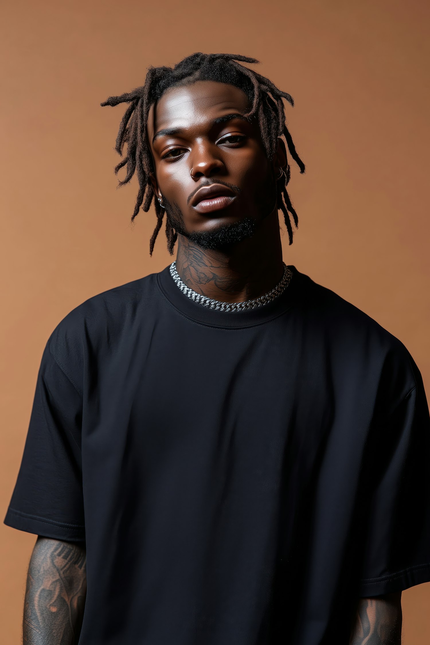 Stylish individual with dreadlocks and tattoos, wearing a black t-shirt and silver chain, against a warm brown background.