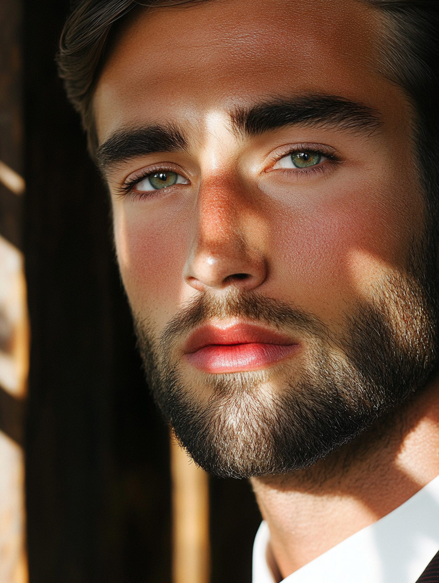 Close-up portrait of a man with green eyes, thick eyebrows, and a full beard, highlighted by soft lighting and a blurred background.