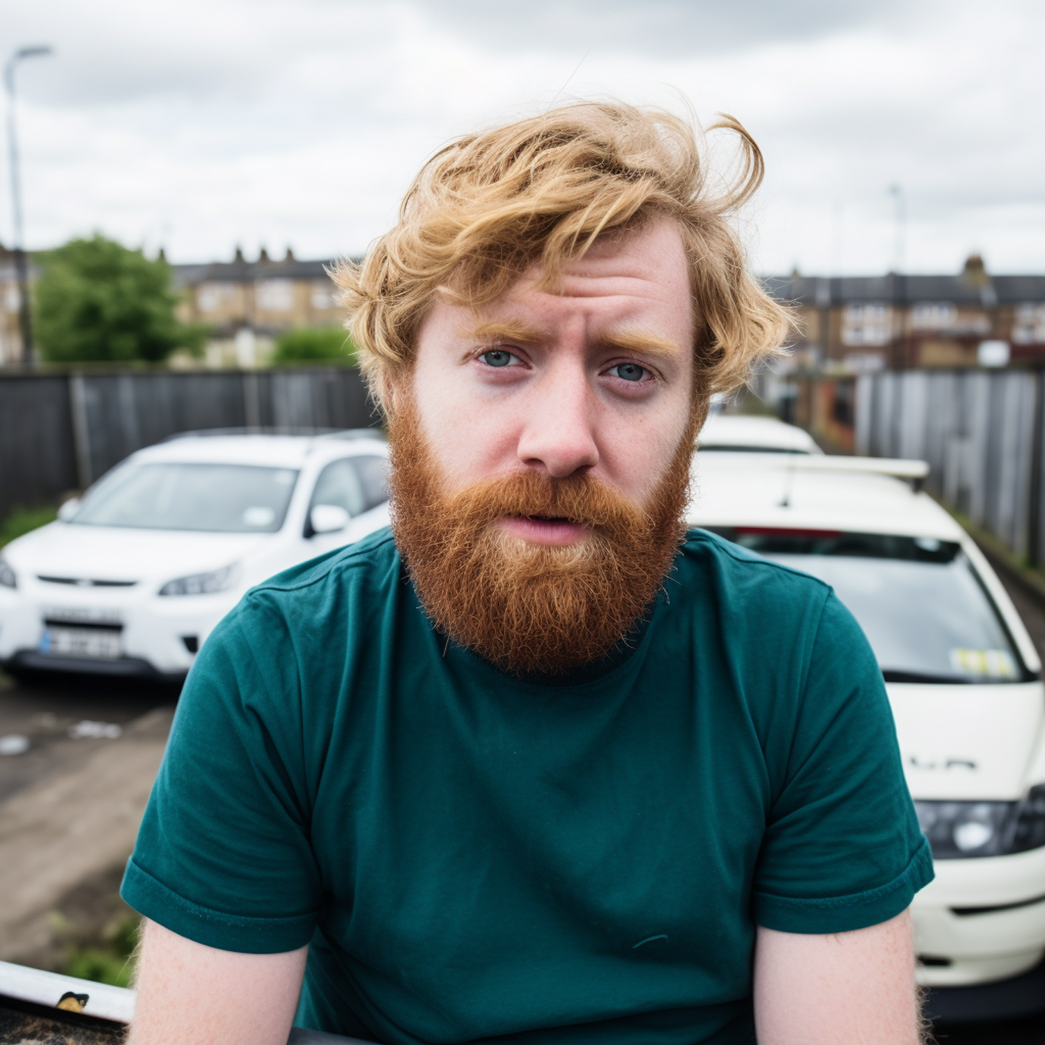 Caucasian man with red beard and teal shirt stands in front of parked cars on a suburban street.