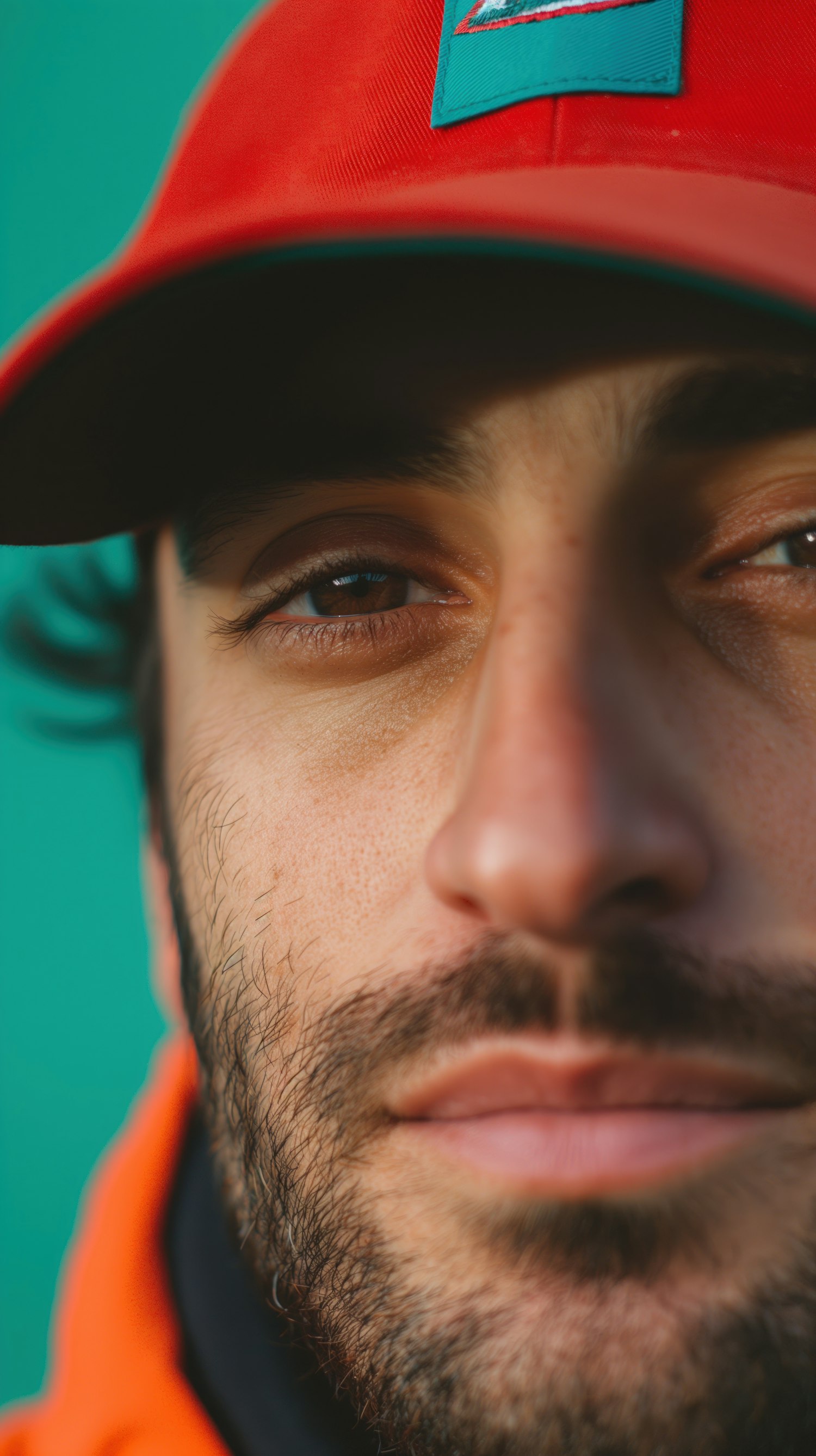 Close-up of a man with a red cap and beard against a teal background, highlighting facial features and textures.