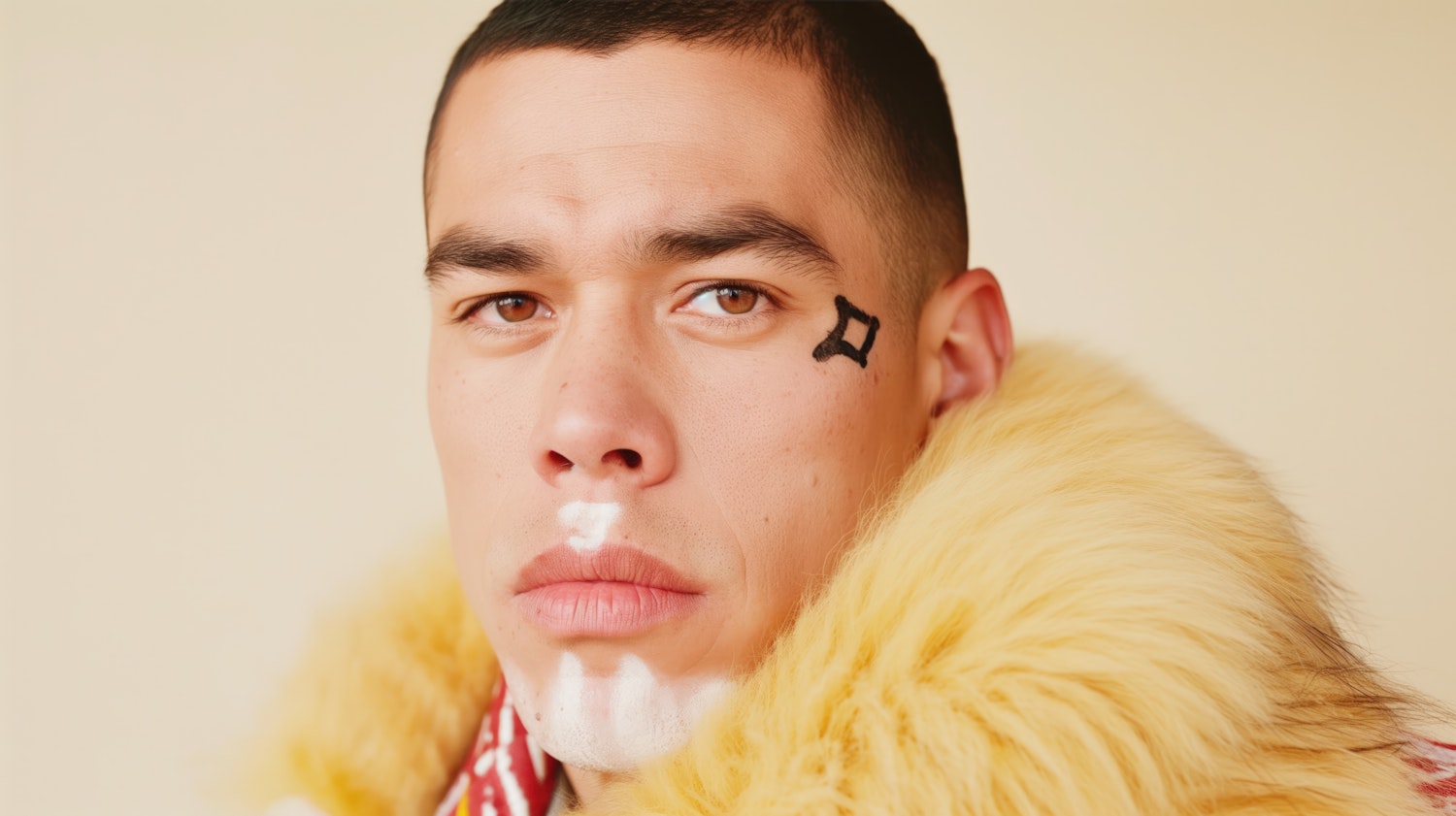 Close-up portrait of a man with a geometric tattoo, white face paint, and a yellow fur collar against a beige background.