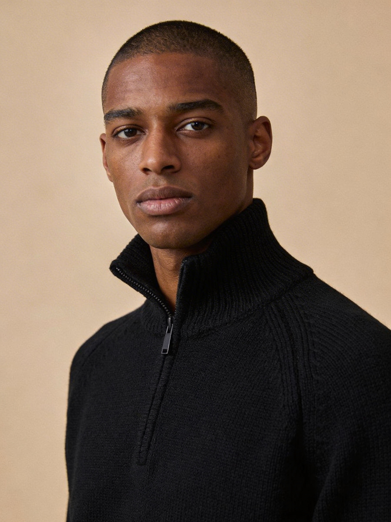 Studio portrait, Scandi-minimal fashion editorial, male early 30s; deep brown skin with cool undertone; close-cropped fade haircut. Outfit: black zip-neck knit (zip halfway, minimal hardware), no logos; subtle matte ring. Solid cool-beige seamless backdrop. Rembrandt lighting with soft fill; 105 mm macro-sharp. Expression: composed, confident, eyes to camera.