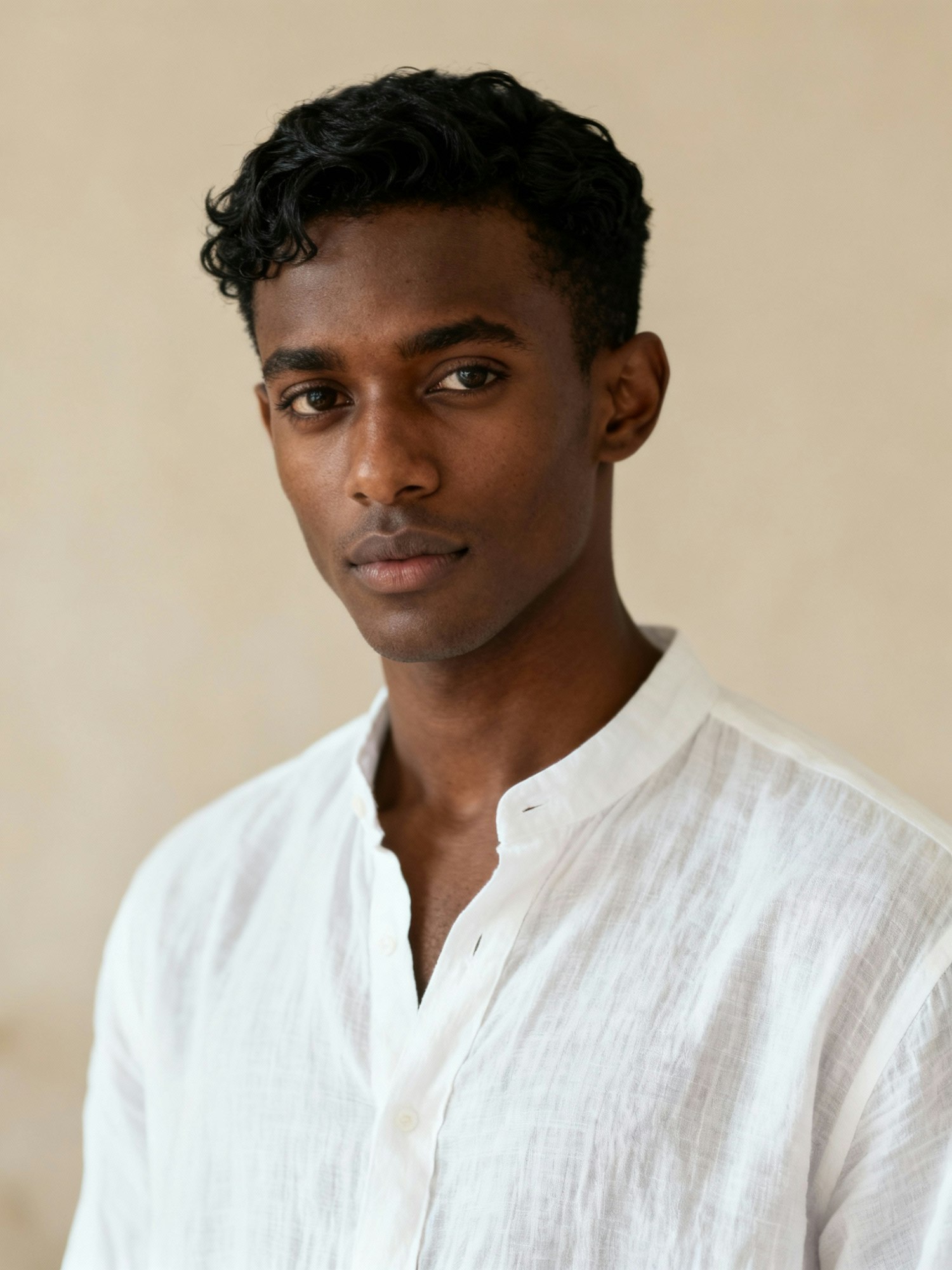 Cinematic portrait of a somalian man, 26; short wavy hair; white linen shirt. Background: plain beige, defocused.