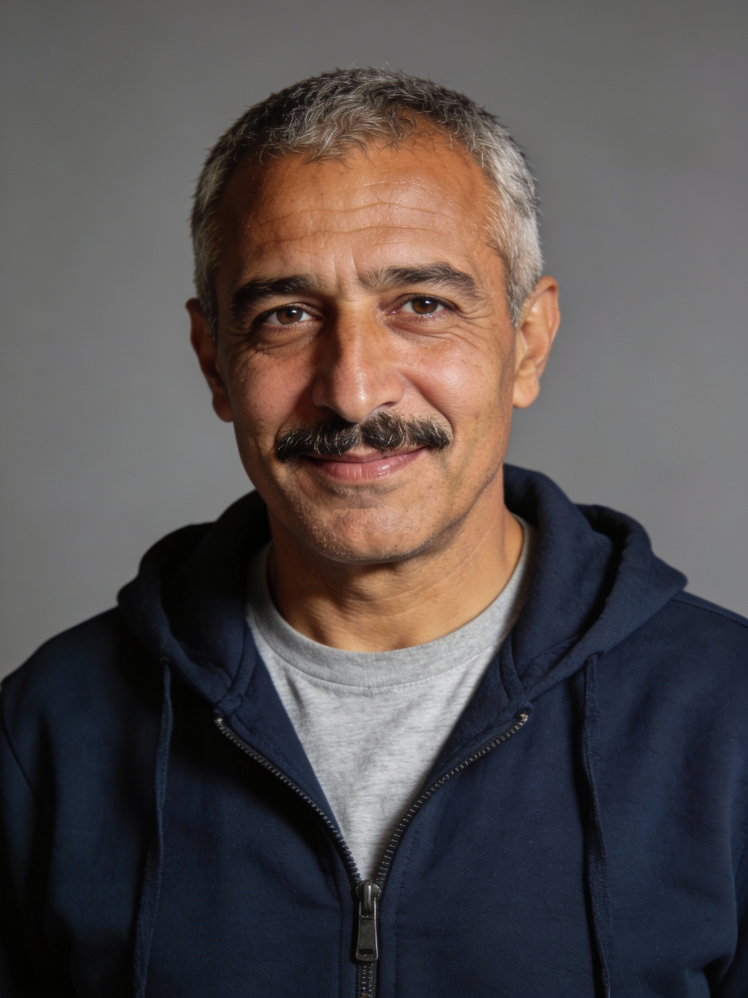 Portrait of a middle-aged man with short gray hair and a mustache, wearing a navy hoodie and gray shirt, smiling gently against a gray background.