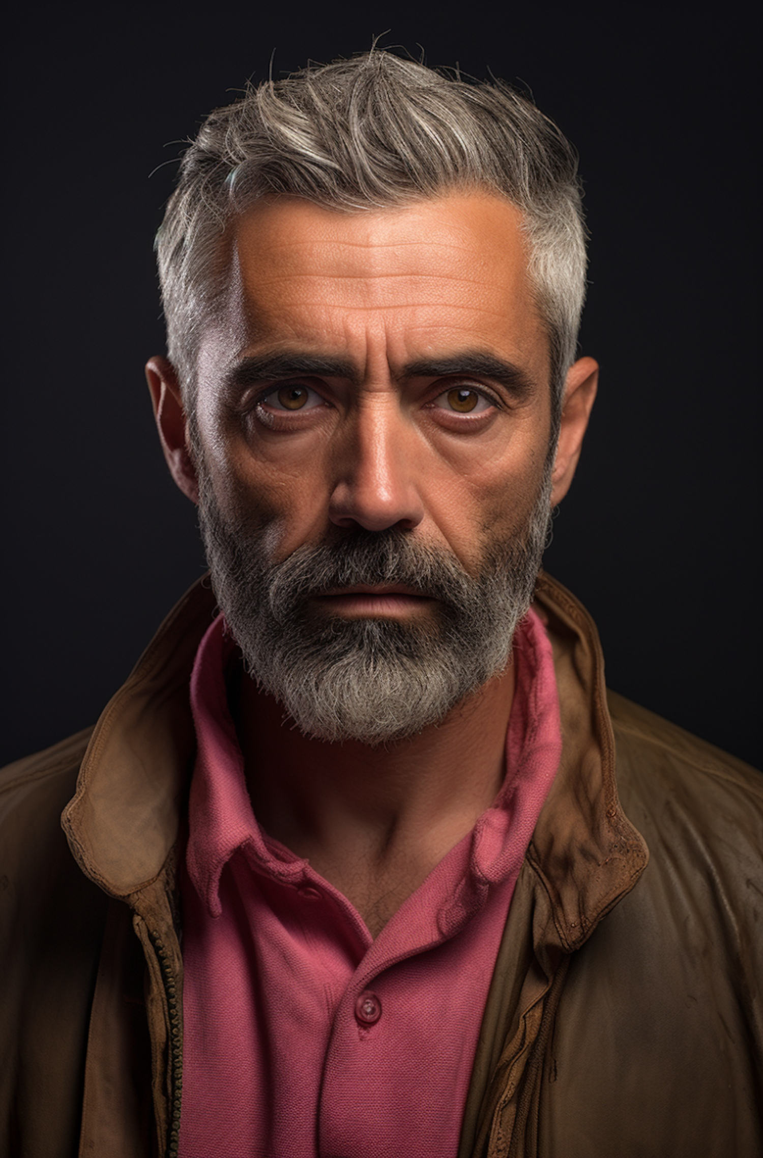 Middle-aged man with gray hair and beard, wearing a pink shirt and brown jacket, against a dark background.