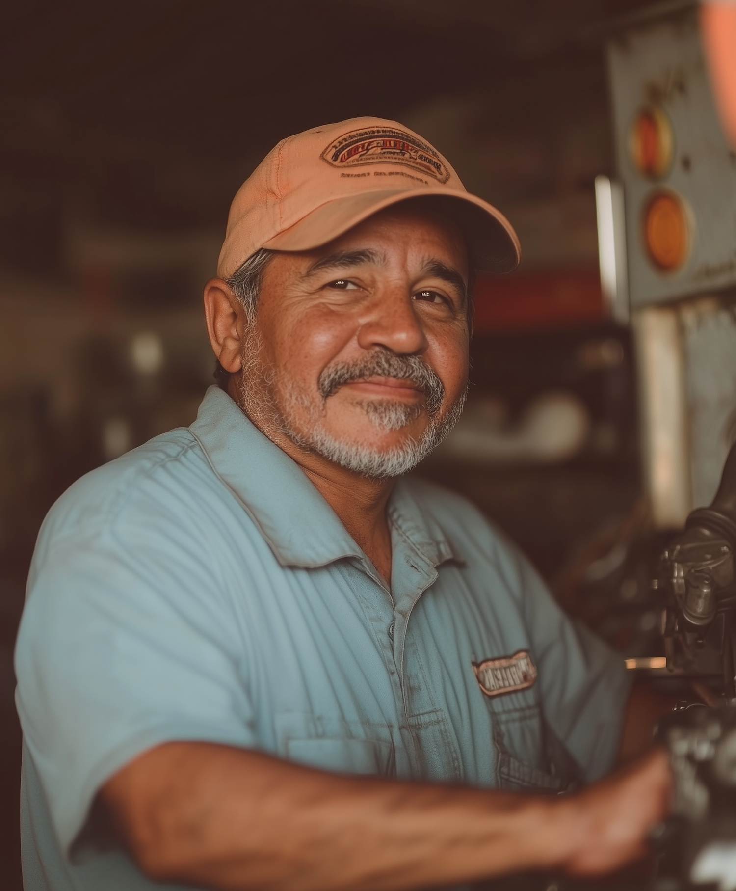 Smiling Hispanic man in a workshop, wearing a blue work shirt and peach cap, with a warm, friendly expression.
