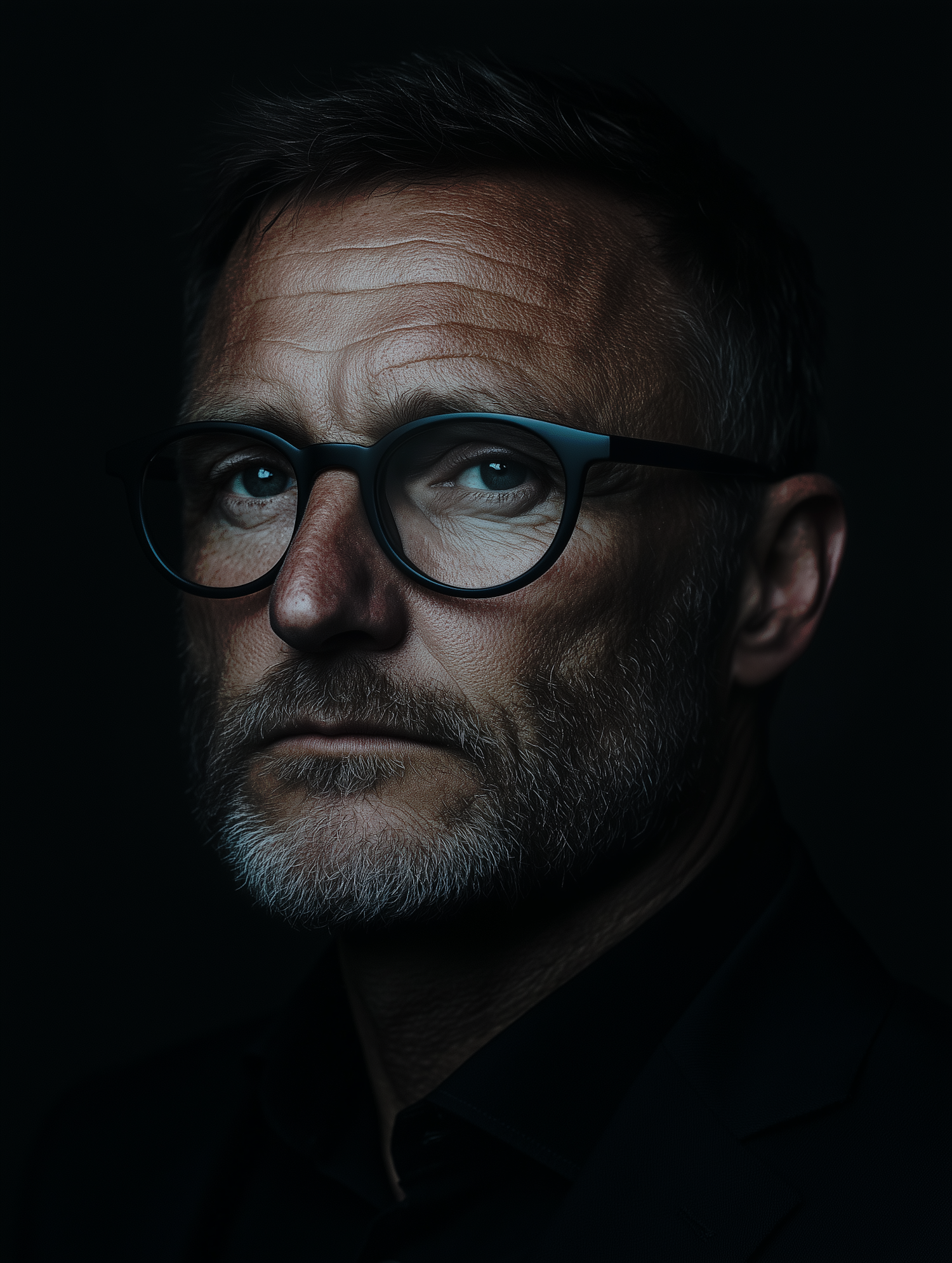 Close-up portrait of a middle-aged man with glasses, blue eyes, and a salt-and-pepper beard, set against a dark background.