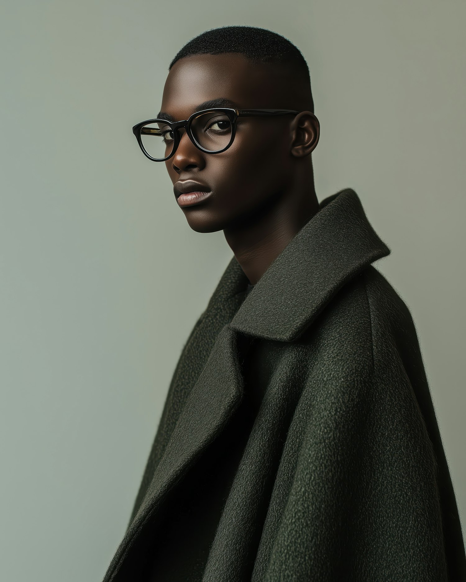 Stylish portrait of a young man in glasses and a green coat against a soft green background, exuding elegance and confidence.