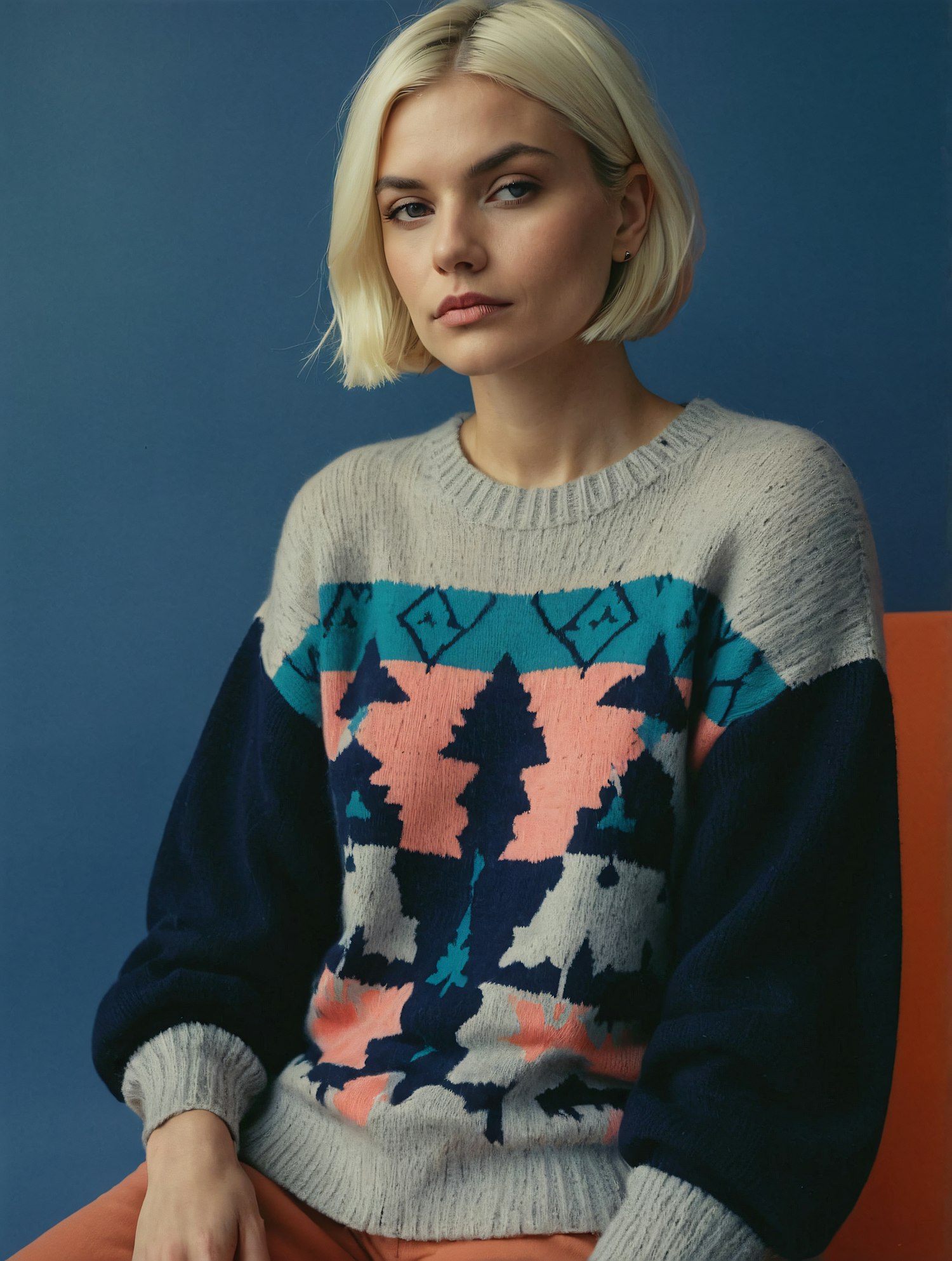 Stylish woman with platinum blonde bob wearing a geometric-patterned sweater, sitting against a blue background with a calm expression.