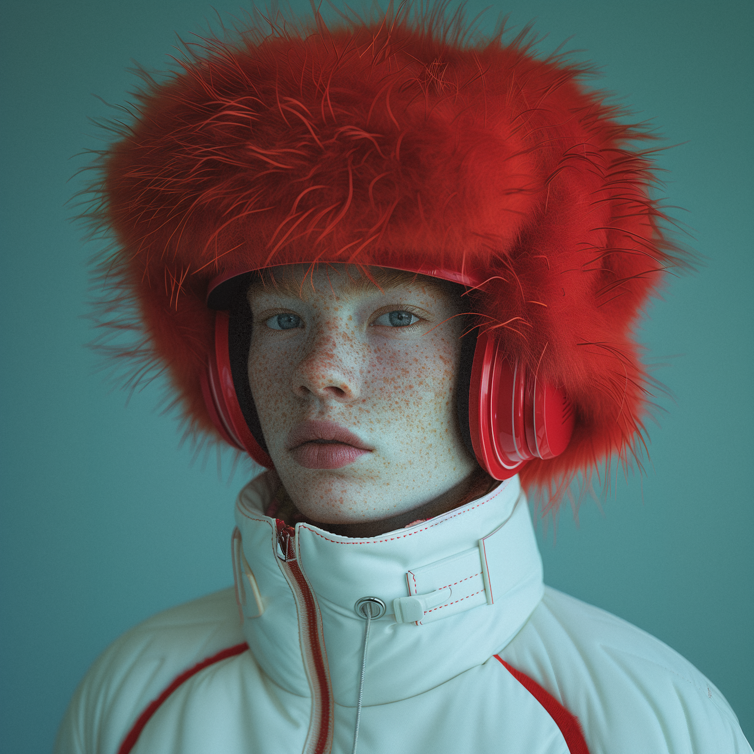 A young person in a red fur hat and white jacket with red accents, set against a teal background. Modern and stylish composition.