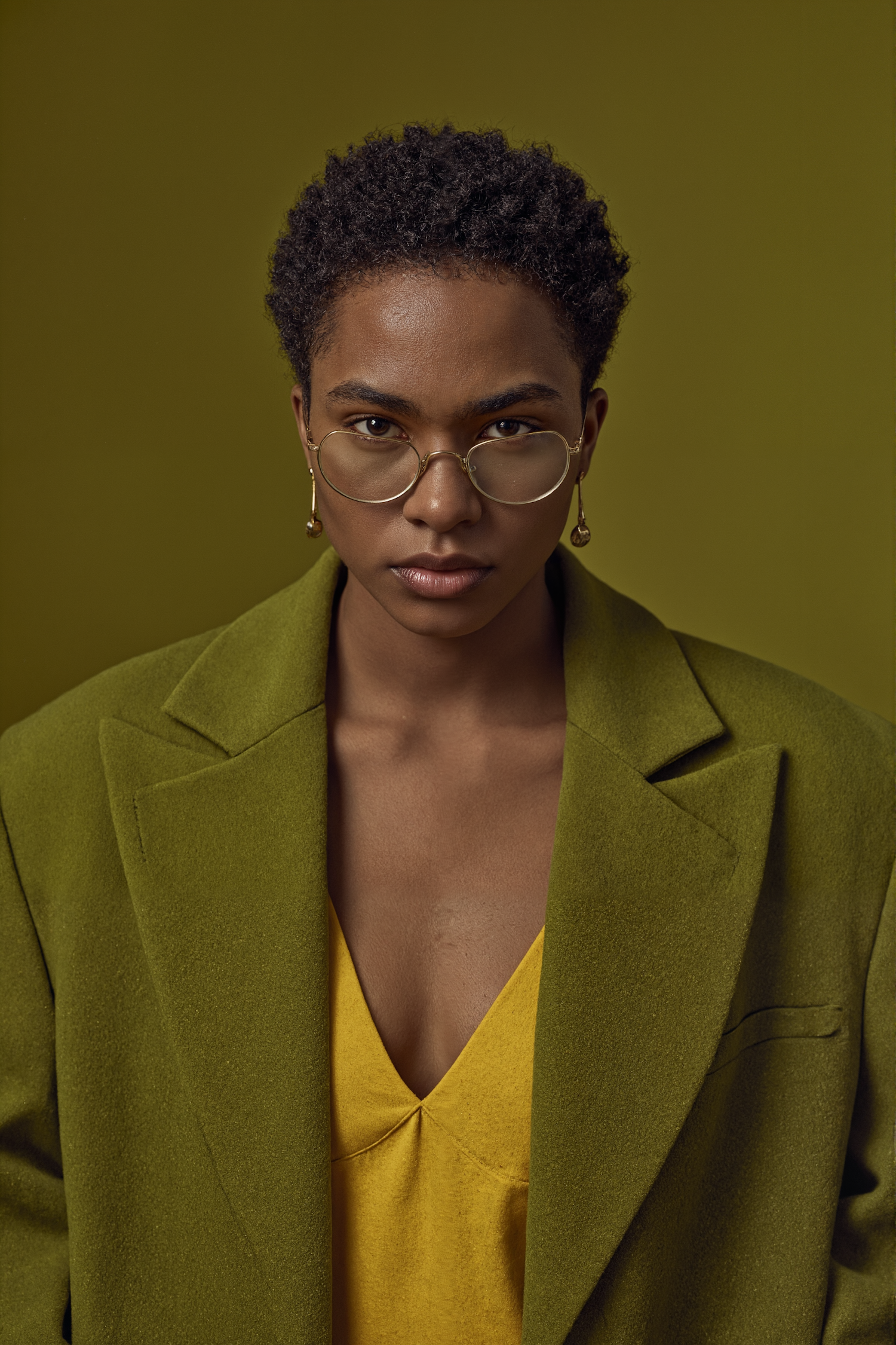 Stylish portrait of a woman in olive green coat and mustard top, wearing gold-rimmed glasses and earrings against a muted green background.