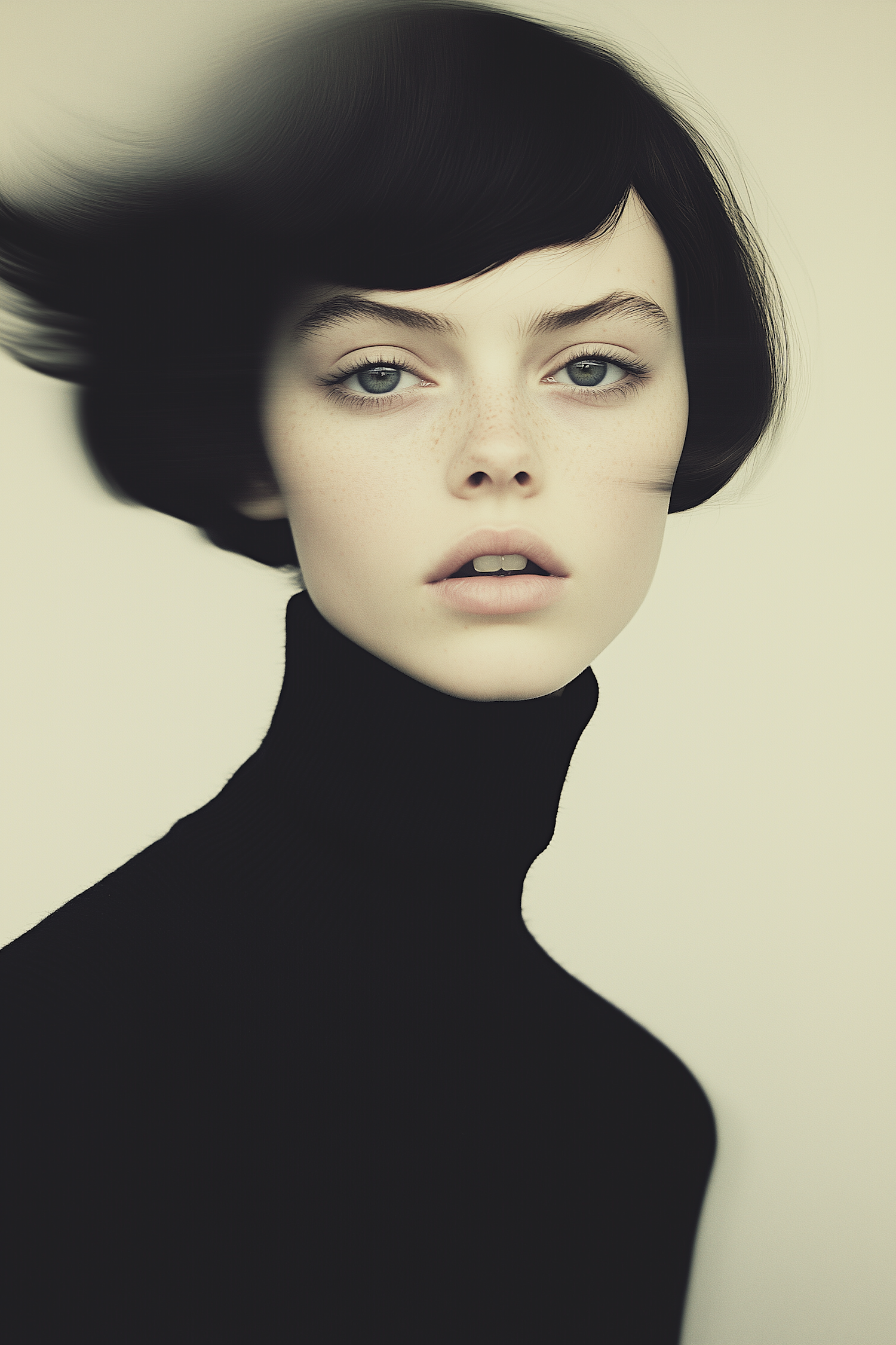 Portrait of a young woman with a sleek bob and black turtleneck, set against a soft beige background. Striking minimalist aesthetic.