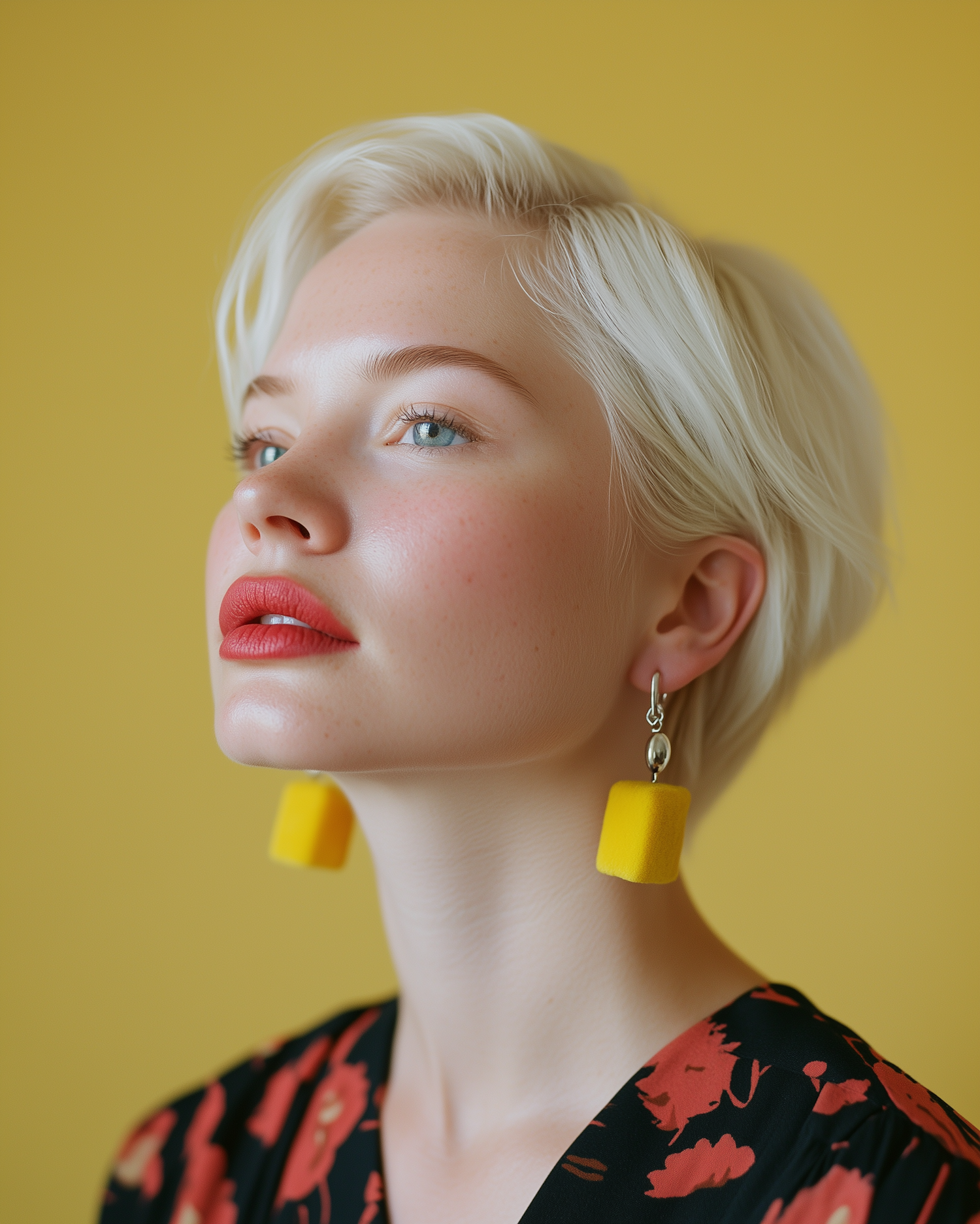 Elegant woman with platinum blonde hair and bold red lips, wearing yellow earrings against a mustard background.