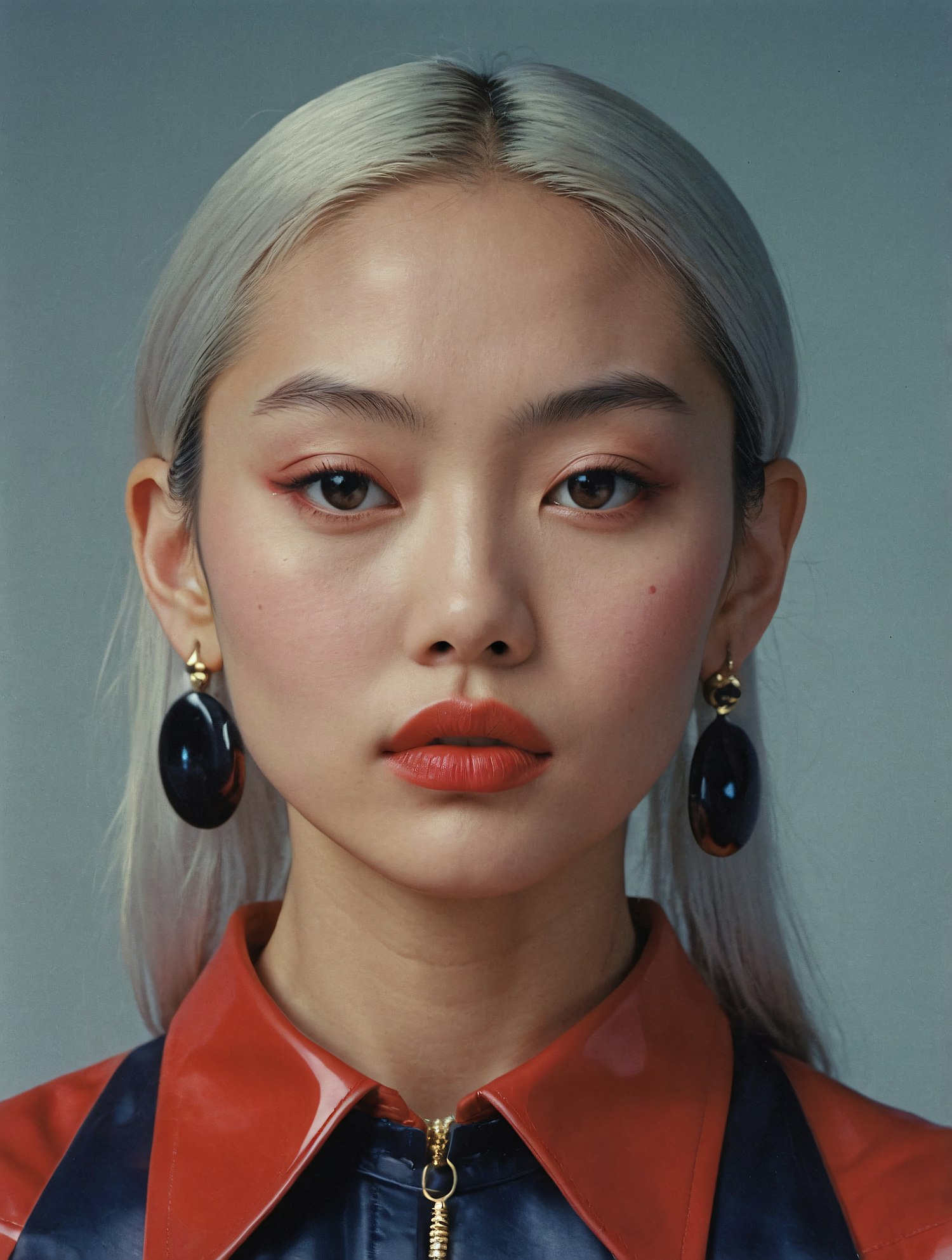 Portrait of an Asian woman with platinum blonde hair, red lips, and bold earrings, wearing a red and black collared outfit.