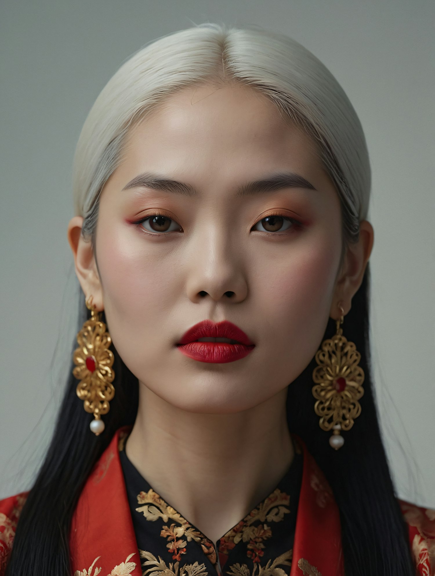 Elegant portrait of an Asian woman with platinum hair, red lips, and ornate gold earrings, exuding sophistication and grace.
