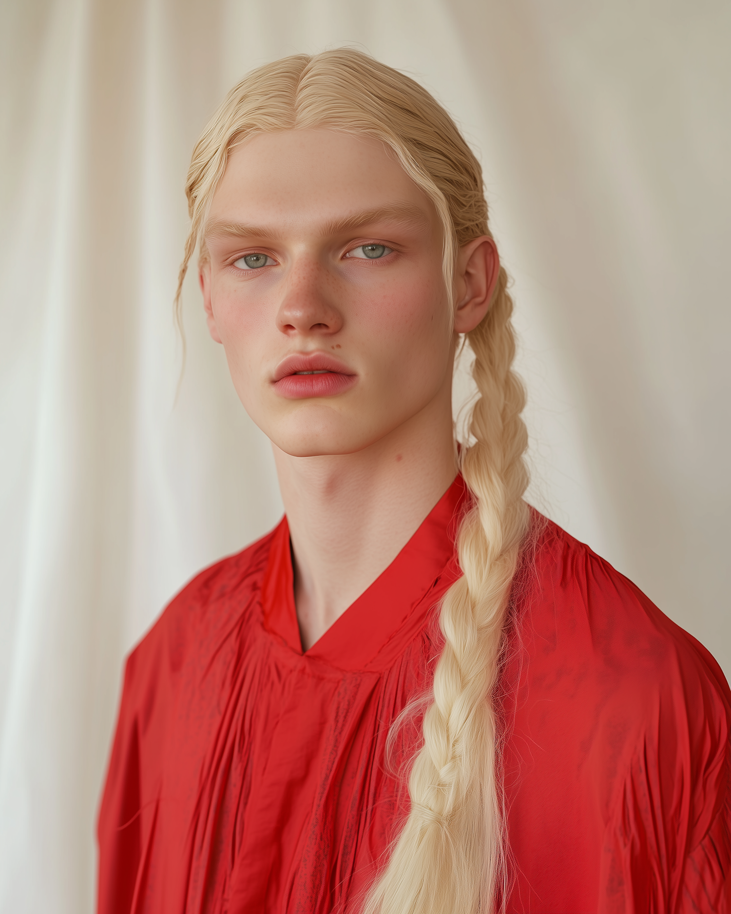 Portrait of a fair-skinned individual with platinum blonde braided hair, light green eyes, and a red high-neck garment against a neutral backdrop.
