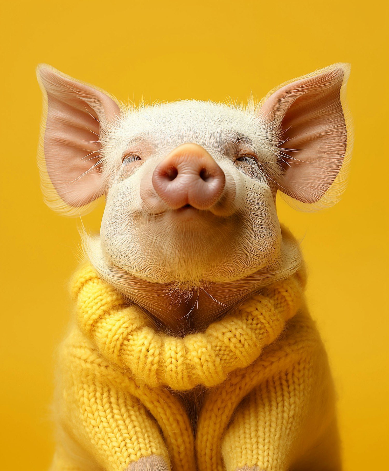 Adorable piglet in a yellow sweater against a vibrant yellow background, exuding warmth and joy with its content expression.