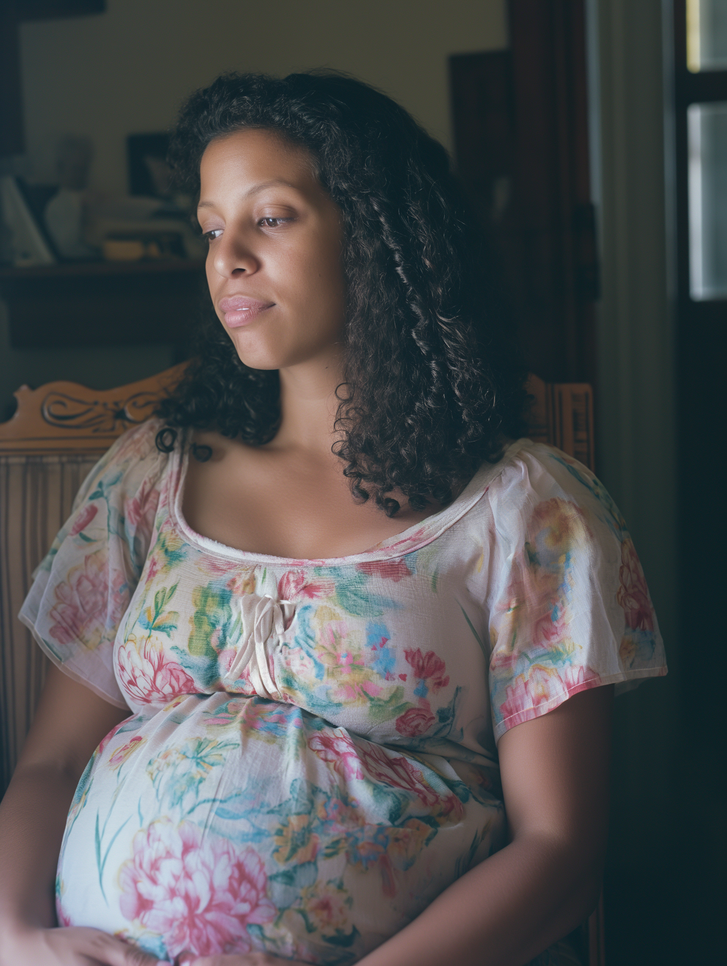 Pregnant woman with curly hair in a floral blouse, sitting in a softly lit room, exuding serenity and contemplation.