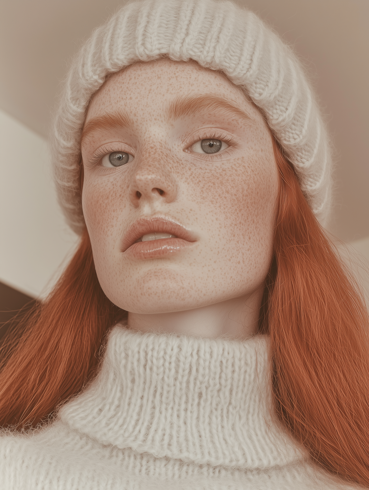 Young woman with red hair and freckles in a white knit beanie and sweater, gazing calmly with light eyes. Cozy and serene vibe.