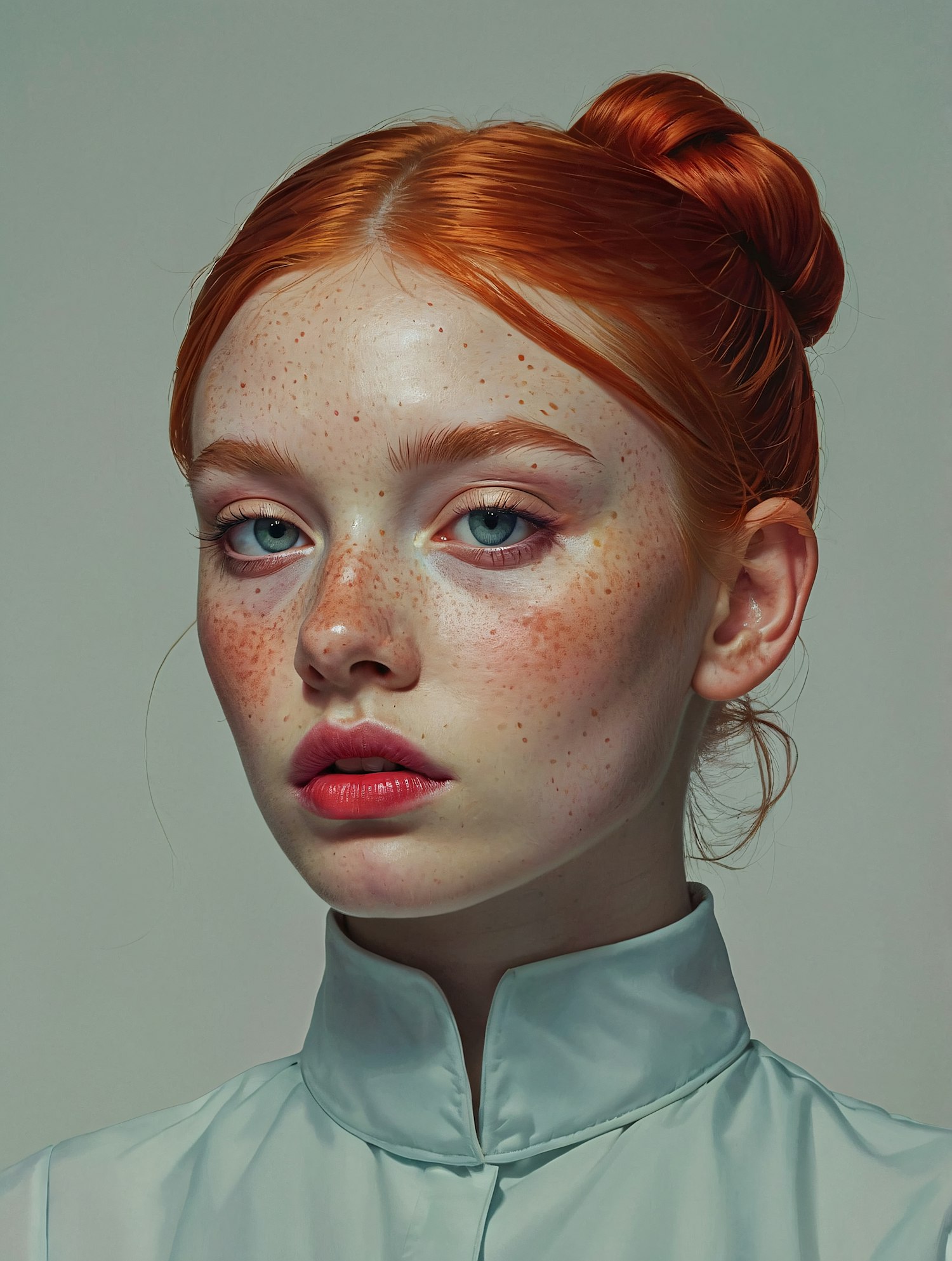 Portrait of a freckled red-haired woman with blue eyes, styled in a bun, wearing a minimalist light blue high-collared outfit.