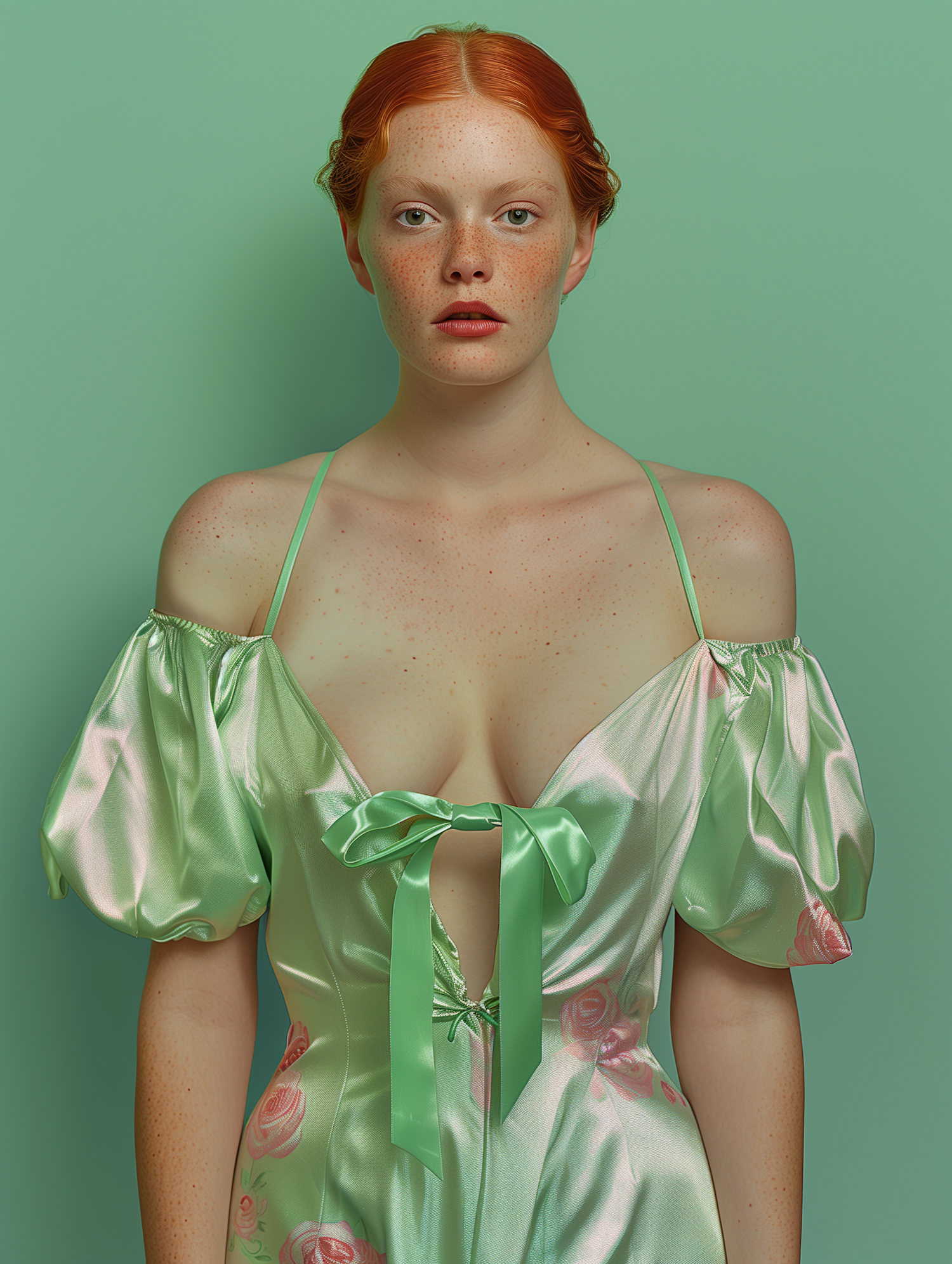 Portrait of a red-haired woman in a mint green dress with floral patterns, set against a matching background.