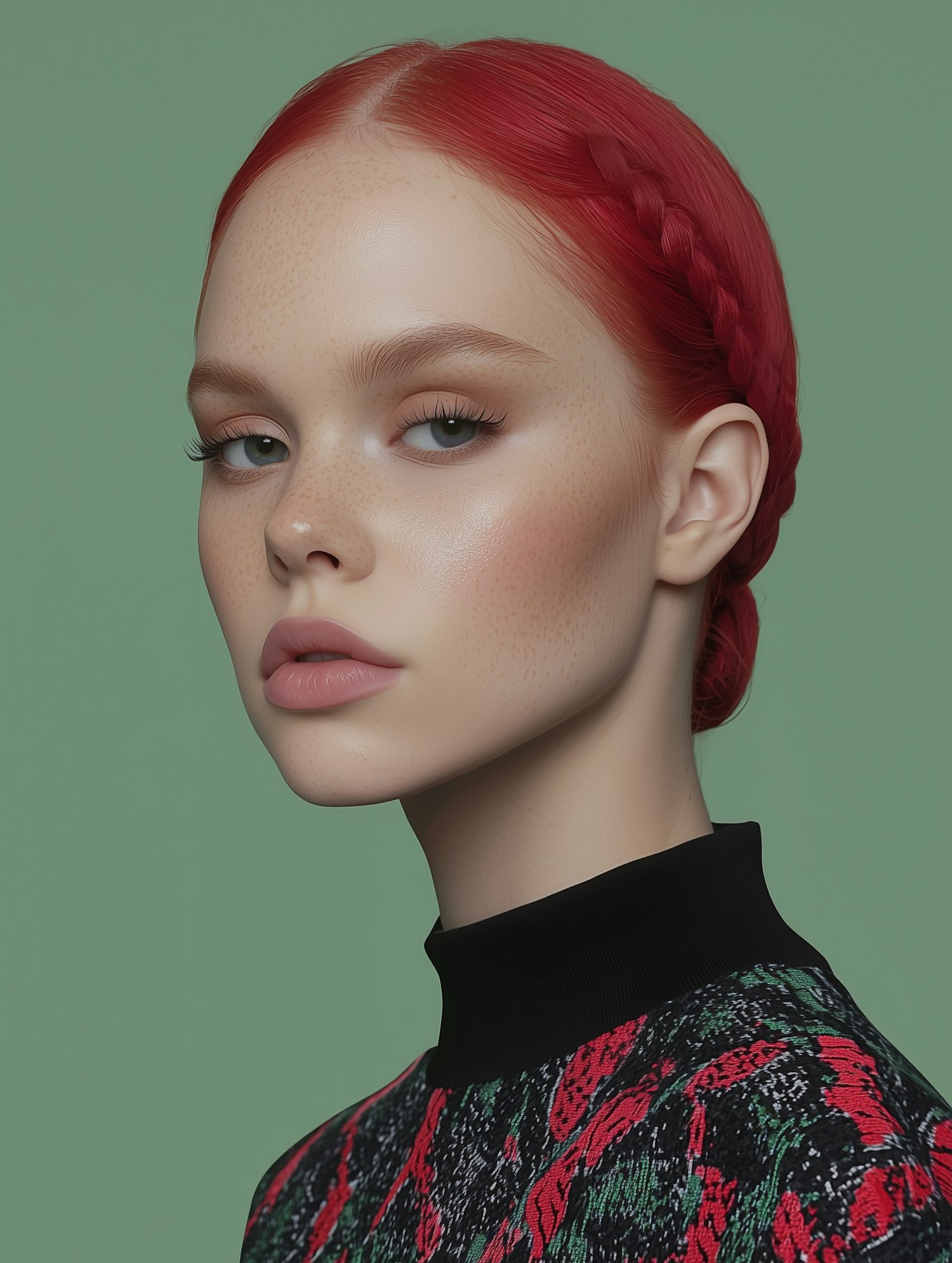 Portrait of a young woman with red braided hair, light green eyes, and a patterned top against a soft green background.