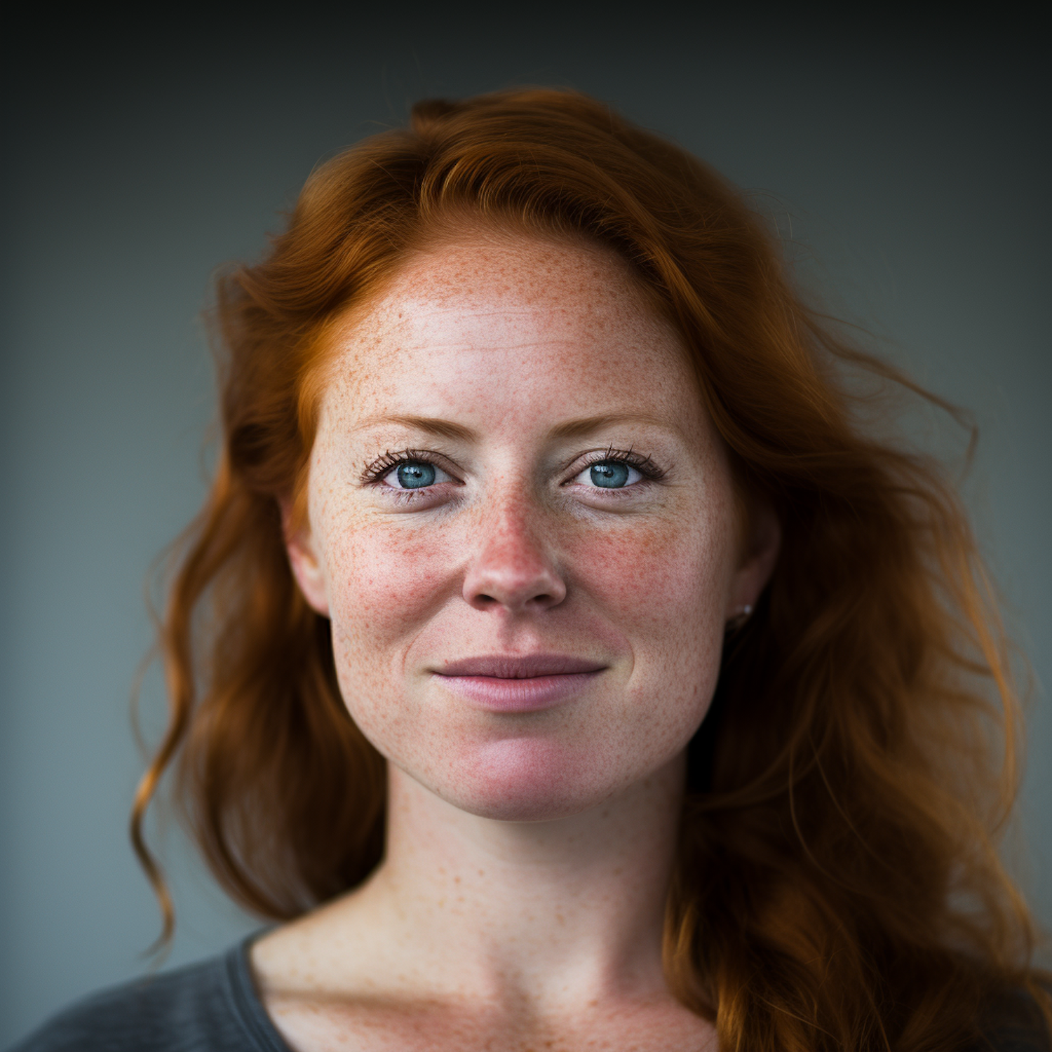 Portrait of a woman with red hair and blue eyes, featuring a serene expression and freckled complexion against a neutral background.