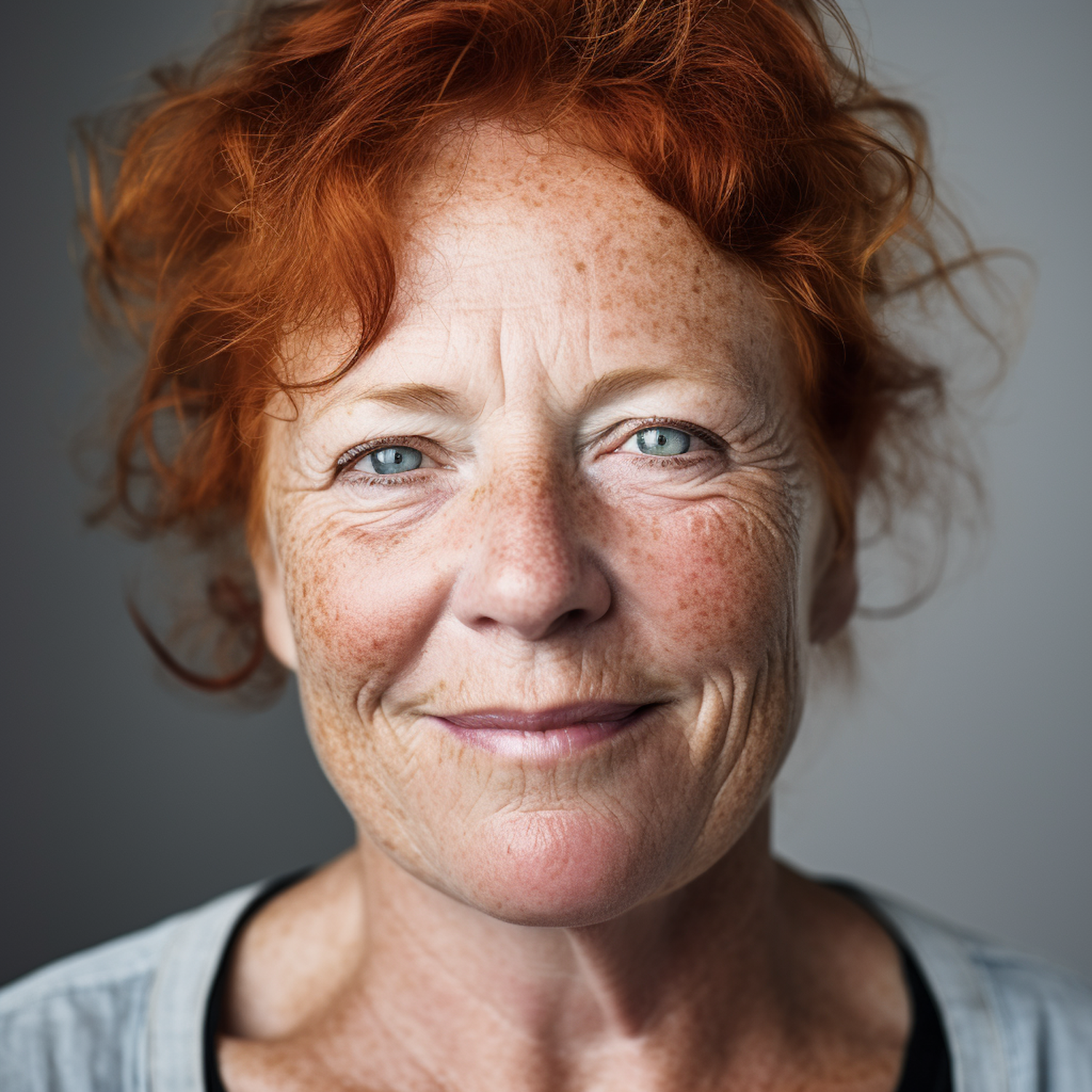 Portrait of a middle-aged woman with red hair, blue eyes, and freckles, smiling gently against a neutral gray background.