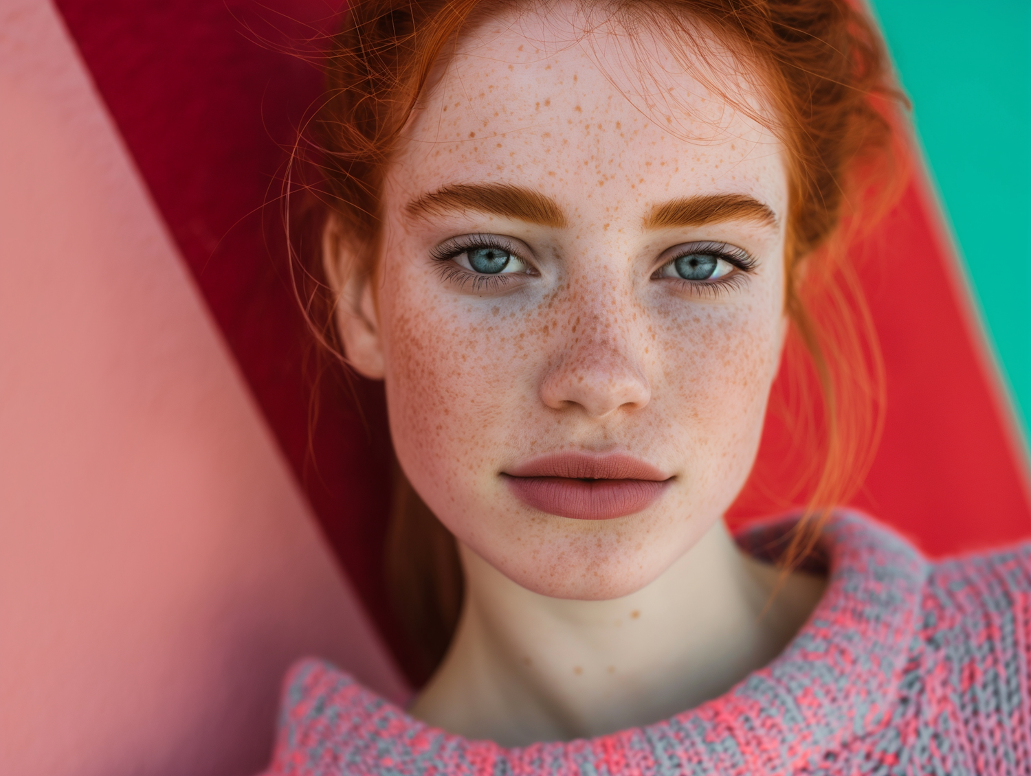 Portrait of a freckled woman with red hair and blue eyes against a colorful background, wearing a pink sweater.