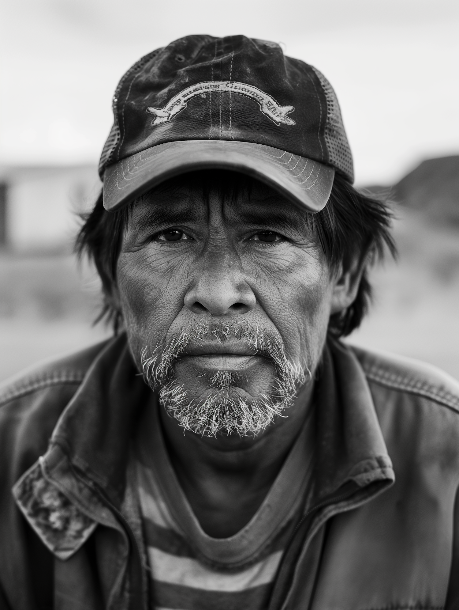 Black and white portrait of a middle-aged man with a rugged look, wearing a cap and jacket, conveying wisdom and experience.